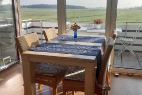 Helles, modern eingerichtetes Wohnzimmer mit komfortabler Schlafcouch und Balkon mit herrlichem Blick über die Felder. Die zum Wohnraum offene Küche ist komplett ausgestattet, inkl. Geschirrspüler und Geschirrtücher. Das separate Schlafzimmer ist mit einem französischem Bett ausgestattet und bei Anreise bereits mit Bettwäsche bezogen. Im Duschbad mit Fenster steht ein Haarfön zu Ihrer Verfügung. Handtücher bringen Sie bitte mit. Ein Kinderreisebett kann gerne mitgebracht werden - Ihr Kleinkind übernachtet dann kostenlos.