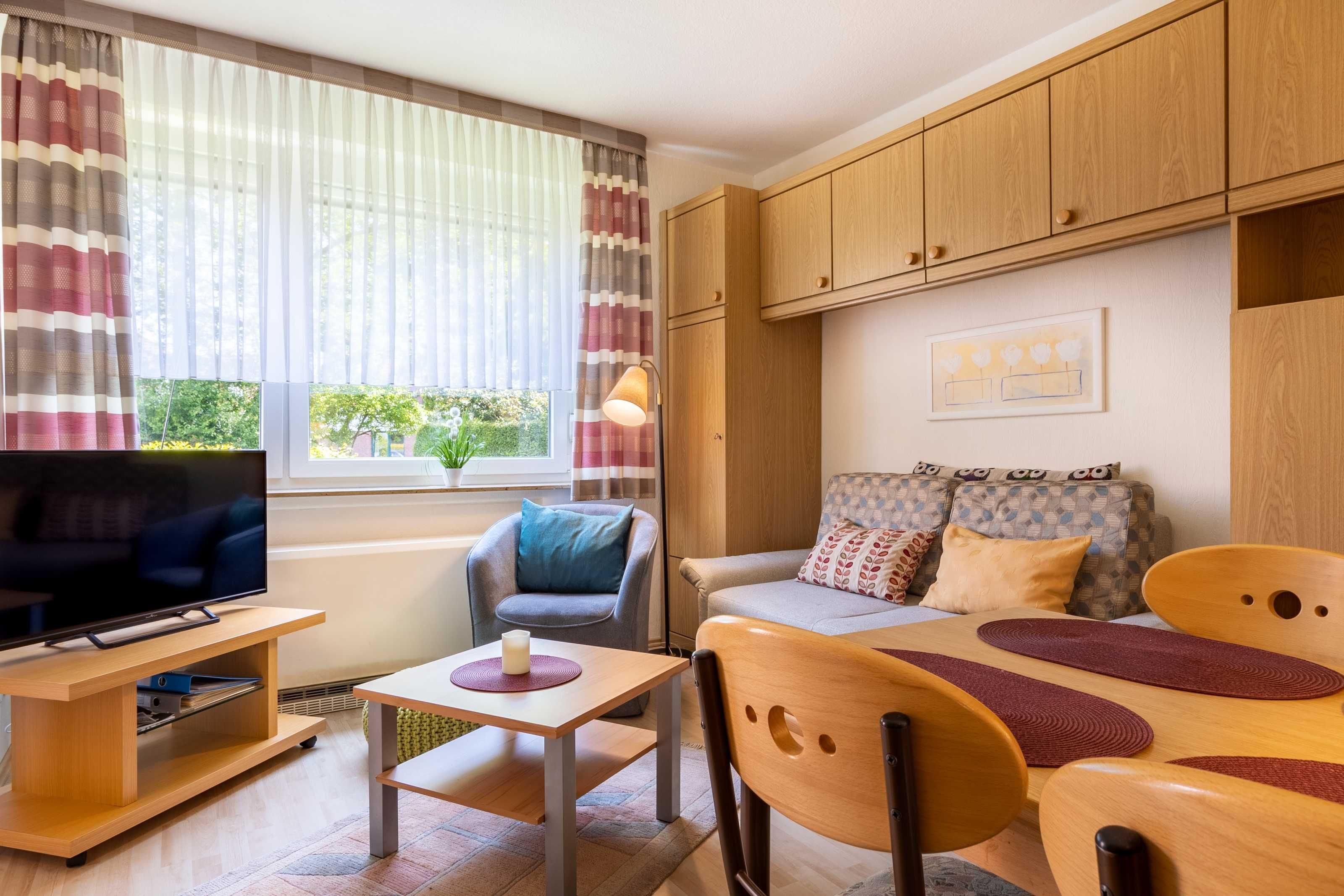 Die ebenerdige, gemütlich eingerichtete Ferienwohnung Wolff ist 30 m² groß und befindet sich zentral in Horumersiel im Fasanenweg in ruhiger Sackgassenlage. Die Ferienwohnung ist mit viel Liebe eingerichtet und bietet zwei Personen ausreichend Platz für einen erholsamen Urlaub am Meer. Die kleine, offene Pantryküche ist im Wohnzimmer integriert. Sie verfügt über ein Kochfeld mit vier Herdplatten, einen Kühlschrank, Wasserkocher, Kaffeemaschine und Toaster. Das Schlafzimmer mit Doppelbett kann durch eine Schiebetür vom Wohnbereich abgetrennt werden. Das Wohnzimmer mit TV und Satellitenempfang bietet ein Sofa und einen gemütlichen Fernsehsessel. Das Badezimmer verfügt über eine Dusche und WC. Ein Balkon schließt sich dem Schlafzimmer an und lädt an sonnigen Tagen zum Frühstück im Freien ein. Der Strand sowie alle Einrichtungen des täglichen Bedarfs können Sie bequem zu Fuß erreichen. Ein eigener Parkplatz befindet sich direkt am Haus. Die Wohnung verfügt über eine Stromheizung, die Böden sind im Wohn- und Schlafraum mit Laminat ausgelegt.