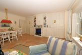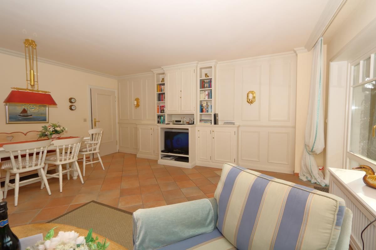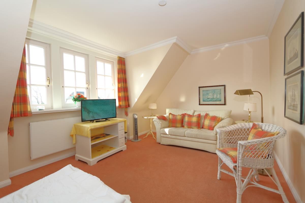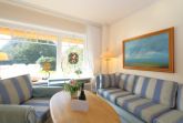 An das Wohnzimmer schließt eine sonnige Südterrasse mit kleinem Garten an. Strandkorb und Gartenmöbel sind vorhanden.
