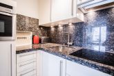 Küche mit Ceran-Kochfeld und Dunstabzug, Backofen, Filter-Kaffeemaschine, elektrischer Wasserkocher und Toaster sind selbstverständlich.