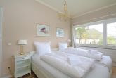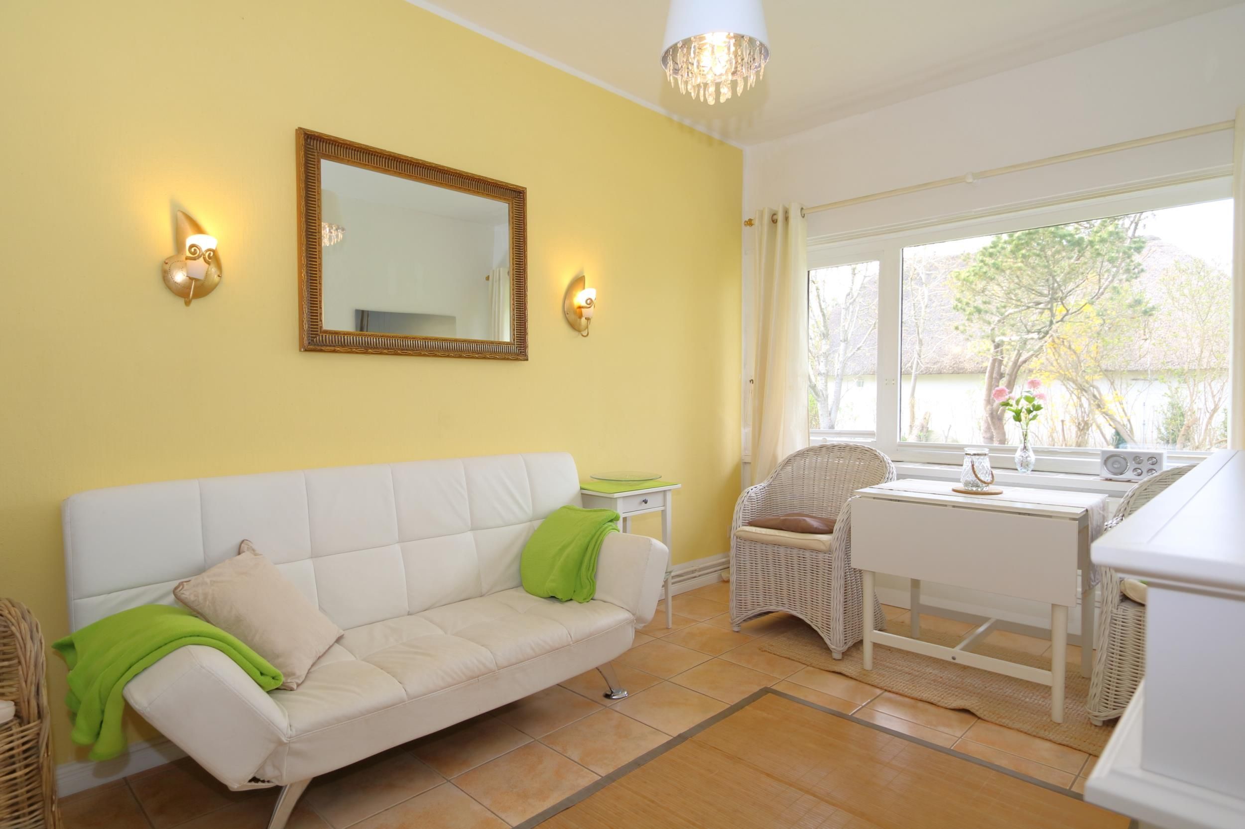 Das Wohnzimmer hat eine Schlafcouch und den Essplatz. Eine neue vollausgestatte kleine Küche mit Geschirrspülmaschine, Mikrowelle/Backofen/Grill und Ceranfeld ist vorhanden. Im Schlafzimmer steht ein Doppelbett. Von hier gelangt man in das Duschbad. Die Einrichtung ist sehr gemütlich im Landhausstil gehalten. Im Garten stehen Strandkorb und Gartenmöbel.