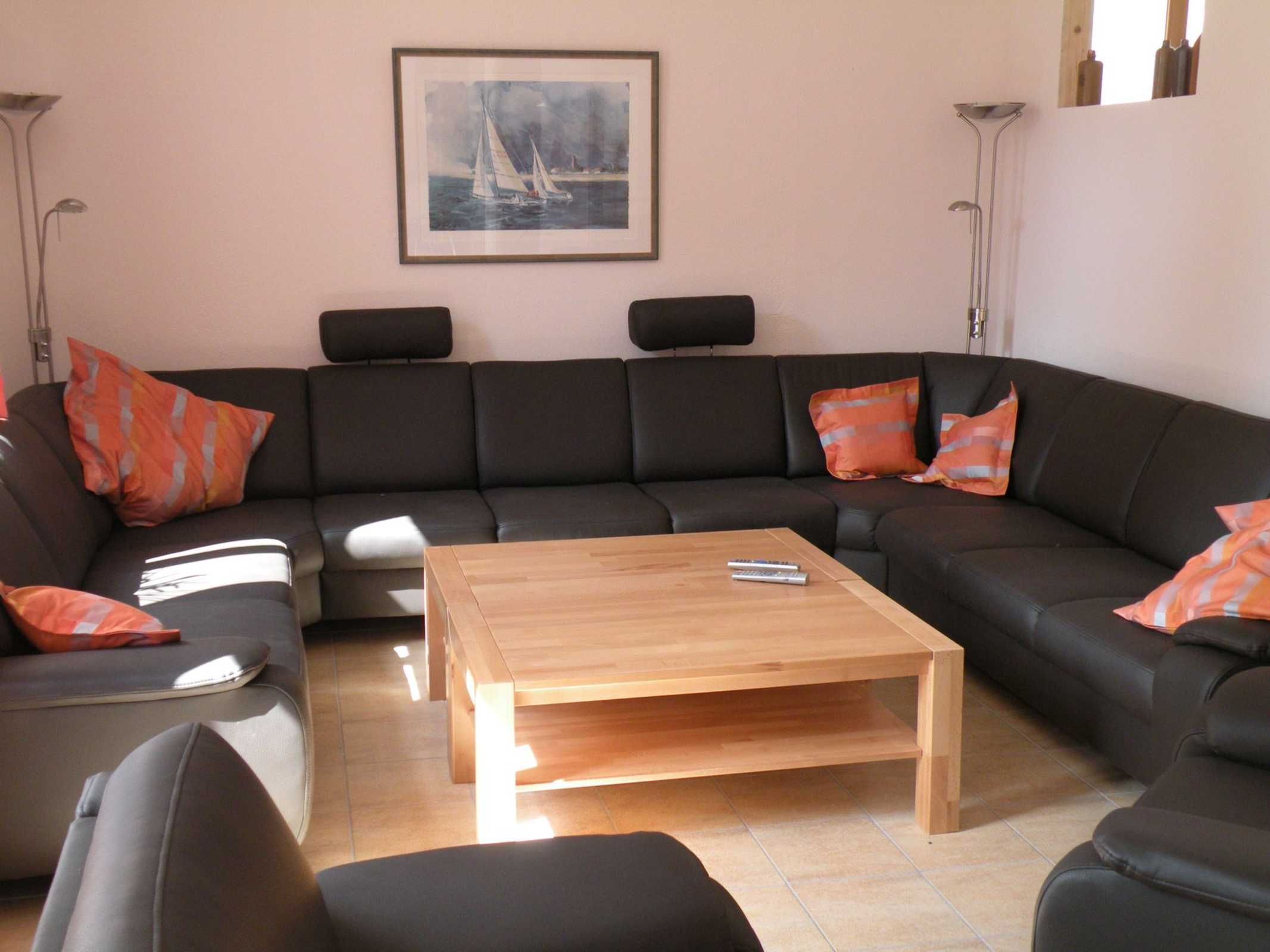Großes Wohnzimmer mit moderner Polsterrundecke, 2 Sessel (bequem für 12 Personen), Tisch, Farb-TV mit Sat-Anlage, Stereoanlage mit CD, Diverses.