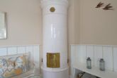 Ein helles Wohnzimmer mit großer Fensterfront zur möblierten Terrasse, Kaminofen. TV SAT/Kabel, Stereoanlage, Sofa.großer Eßtisch mit Bank und gemütlichen Stühlen, Ofen, CD-Player, Bücher, Blu-ray-Player