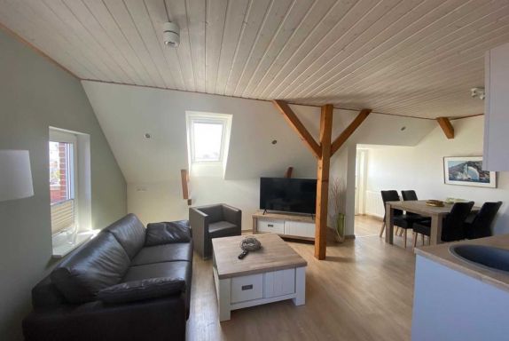 • vom Wohnzimmer und der gemütlichen Essecke hat man eine Traumblick auf den Sielhafen mit seiner Kutterflotte