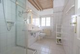 WC, Dusche, Waschbecken, Spiegel, Fenster und ausreichend Handtücher und Vorleger.