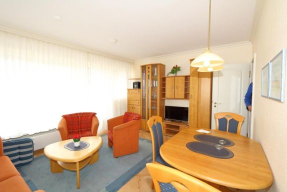 Der Wohnraum ist geschmackvoll und freundlich gestaltet mit einer gemütlichen Sitzgruppe und einem Essplatz für 4 Personen. Das Sofa läßt sich mit wenigen Handgriffen in einen zusätzlichen Schlafplatz für 2 Personen umwandeln. Die nicht direkt einsehbare offene Küche mit Geschirrspüler, Ceranfeld & Kühlschrank ist zweckmäßig und komfortabel ausgestattet.