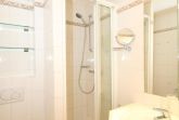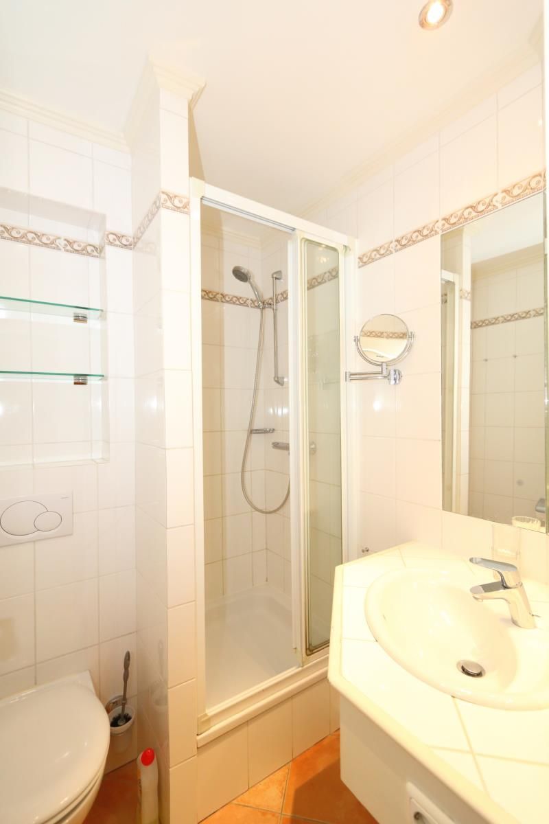 Badezimmer mit Dusche, WC, Waschtisch. Ausreichend Handtücher und Vorleger.