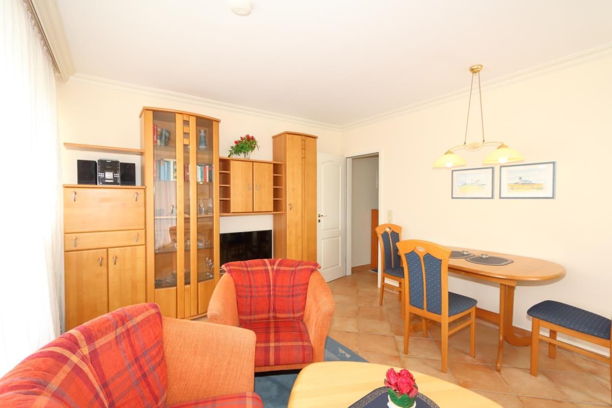 Ein helles Wohnzimmer mit großer Fensterfront zum möblierten Balkon und Dünen mit Sitzecke und Strandkorb. Großer Smart-Tv mit Sat-Anschluß, Eßecke und Couchgarnitur, W'Lan