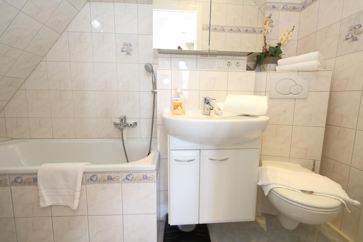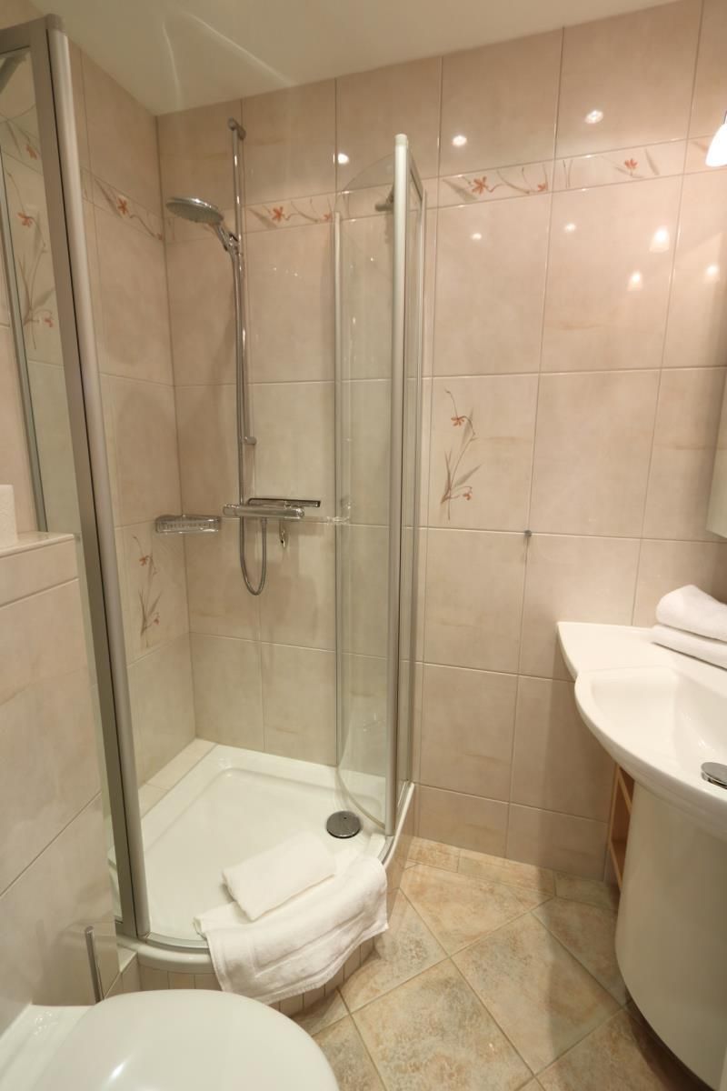 Badezimmer mit Dusche, WC, Waschtisch. Ausreichend Handtücher und Vorleger.