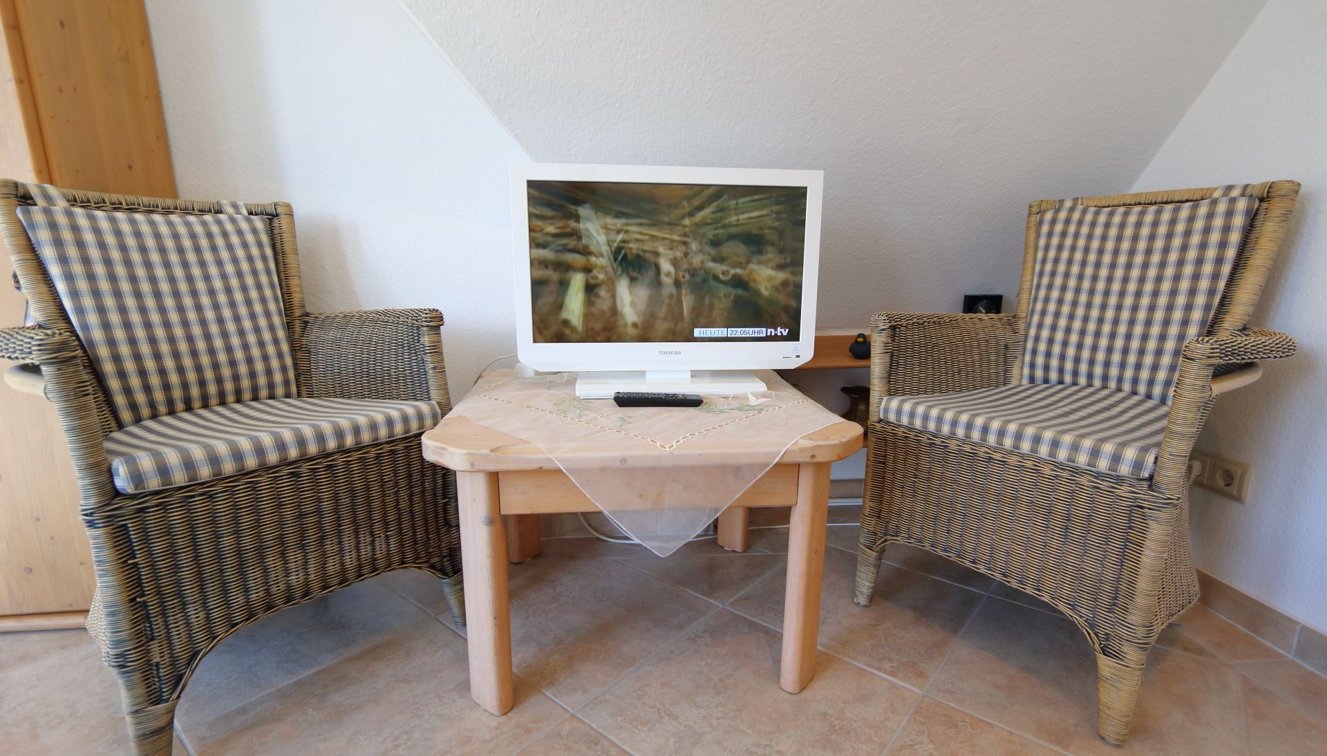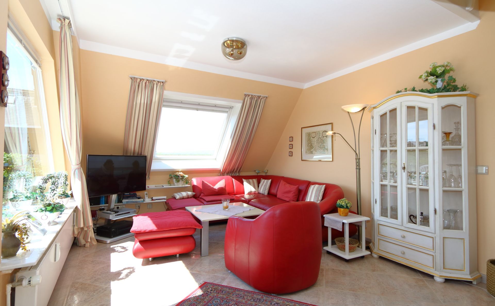Ein helles Wohnzimmer mit großer Fensterfront zum möblierten Balkon und Dünen mit Sitzecke und Strandkorb. Großer Smart-Tv mit Sat-Anschluß, Eßecke und Couchgarnitur, W'Lan, DVD-Player und Telefon mit Flatrate für das deutsche Festnetz.