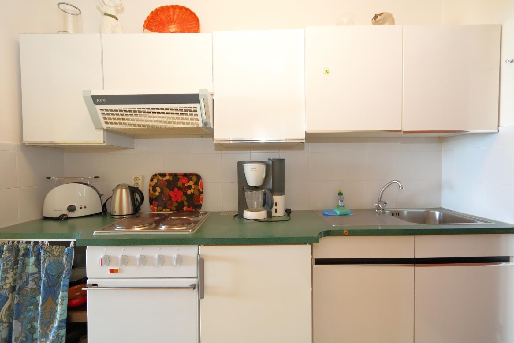 gängige Küchenutensilien, Herd , Dunstabzugshaube, Wasserkocher, Backofen, Filterkaffeemaschine, Toaster, Kühlschrank.