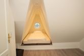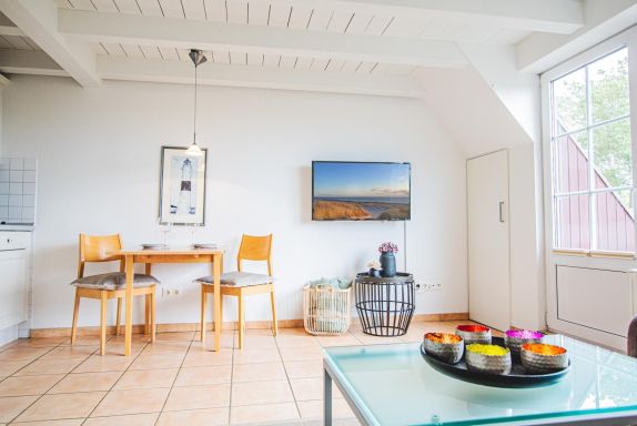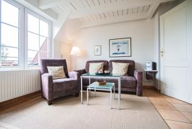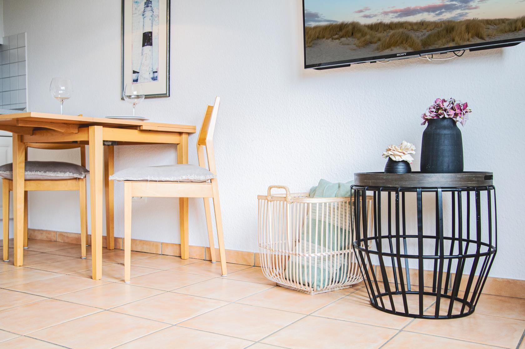 Im Wohnzimmer, dem ein kleiner Südbalkon, mit Blick zur Tinnumburg, vorgelagert ist, steht eine gemütliche Sitzgarnitur und der Essplatz . Die offene Küche ist u. a. mit einem Geschirrspüler ausgestattet. Das Schlafzimmer, mit Doppelbett und einem breiten Bett in der Schräge (für Kinder) ,befindet sich im Dachgeschoss. Das geflieste, neue Bad, ist mit WC, Waschbecken und einer Dusche ausgestattet. Insgesamt eine gehobene und sehr gepflegte Ausstattung.