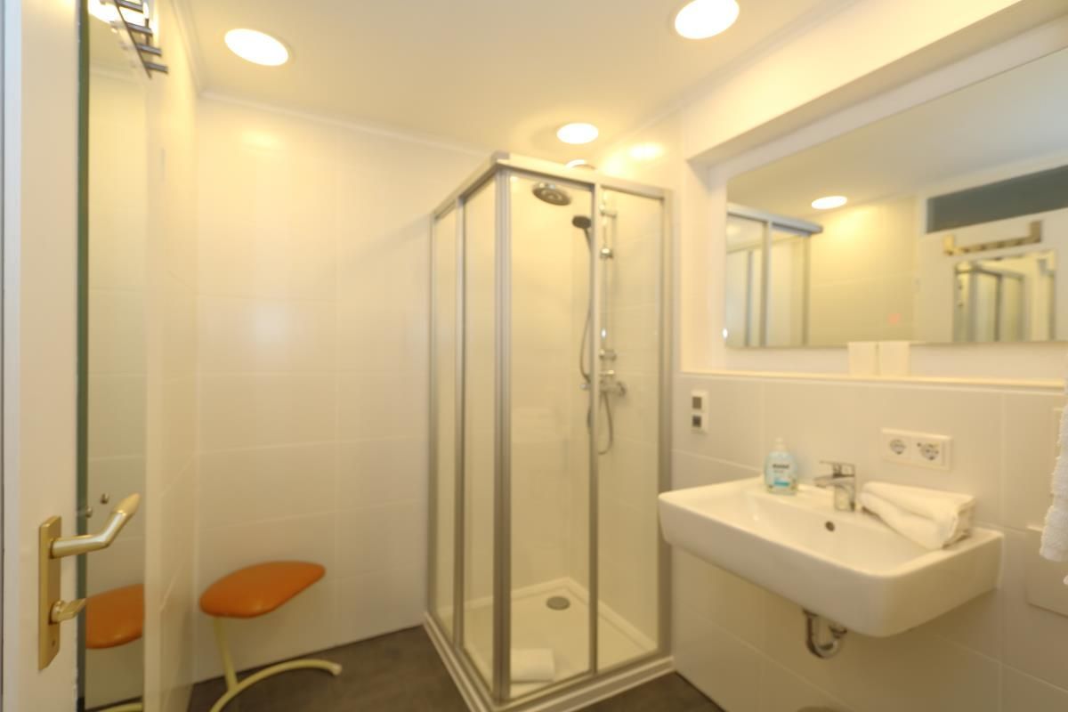 Das Badezimmer verfügt über eine moderne Duschkabine, eine Waage, ein Wandradio und mehrere Handtuchhaken. Durch den Flur mit großem Spiegel und Ablagemöglichkeit gelangen Sie nun in den großen Wohn-/Schlafbereich.