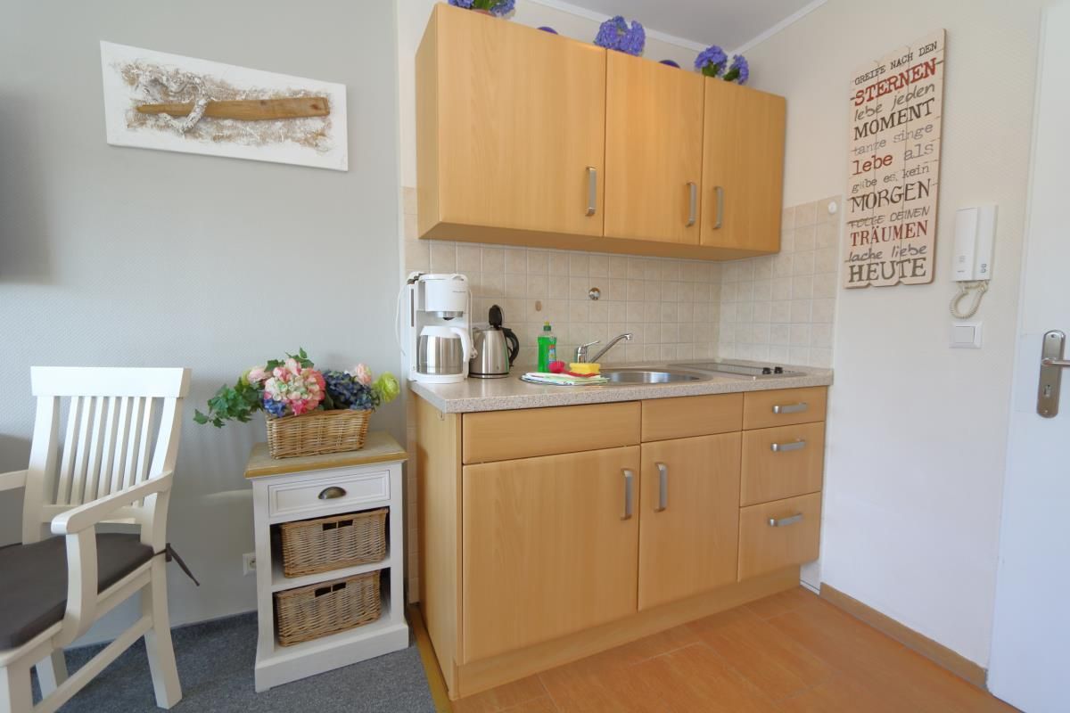 Das offene und helle Ferienappartement verfügt über einen Westbalkon, von dem aus man in Richtung der Friedrichstraße blicken kann. Der praktische Wohn-und Schlafbereich und das Bad mit Duschkabine und vorhandenem Föhn machen diese Ferienwohnung komplett.