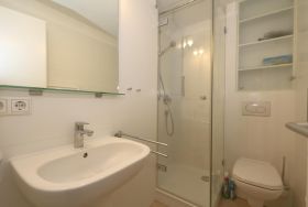 Das Appartement hat ein Wohnzimmer mit offenem Zugang zur Küche und zum Balkon, ein Schlafzimmer und ein Duschbad. Im Wohnzimmer steht u.a. eine bequeme Eck-Ledergarnitur mit Schlaffunktion für 2 Personen. Die Küchenzeile ist komplett ausgestattet. Vom Westbalkon schaut man in den Garten und auf weiter entfernt stehende Häuser. Das Schlafzimmer hat ein Doppelbett, einen ausreichend großen Kleiderschrank und ein zusätzliches TV. Beim Bad handelt es sich um ein Duschbad.