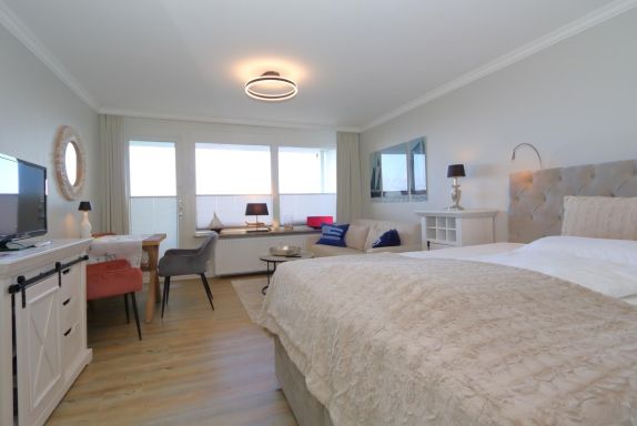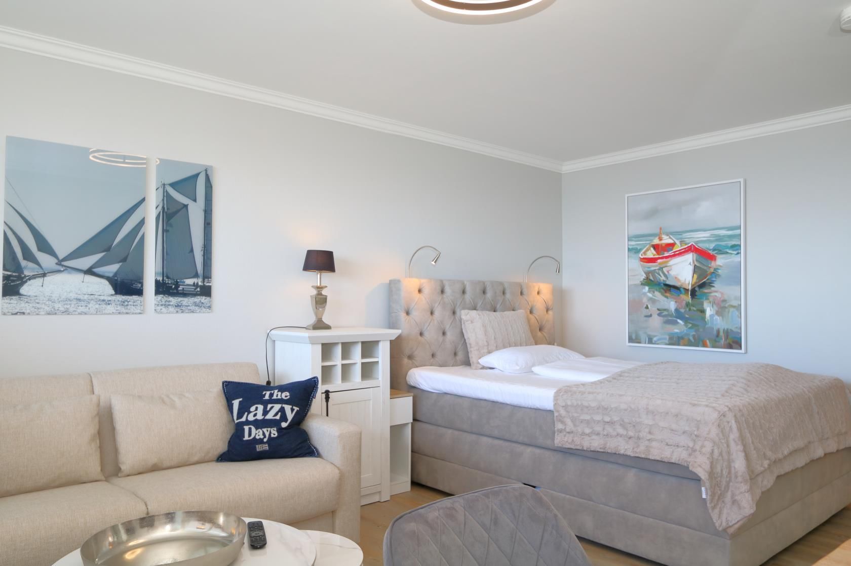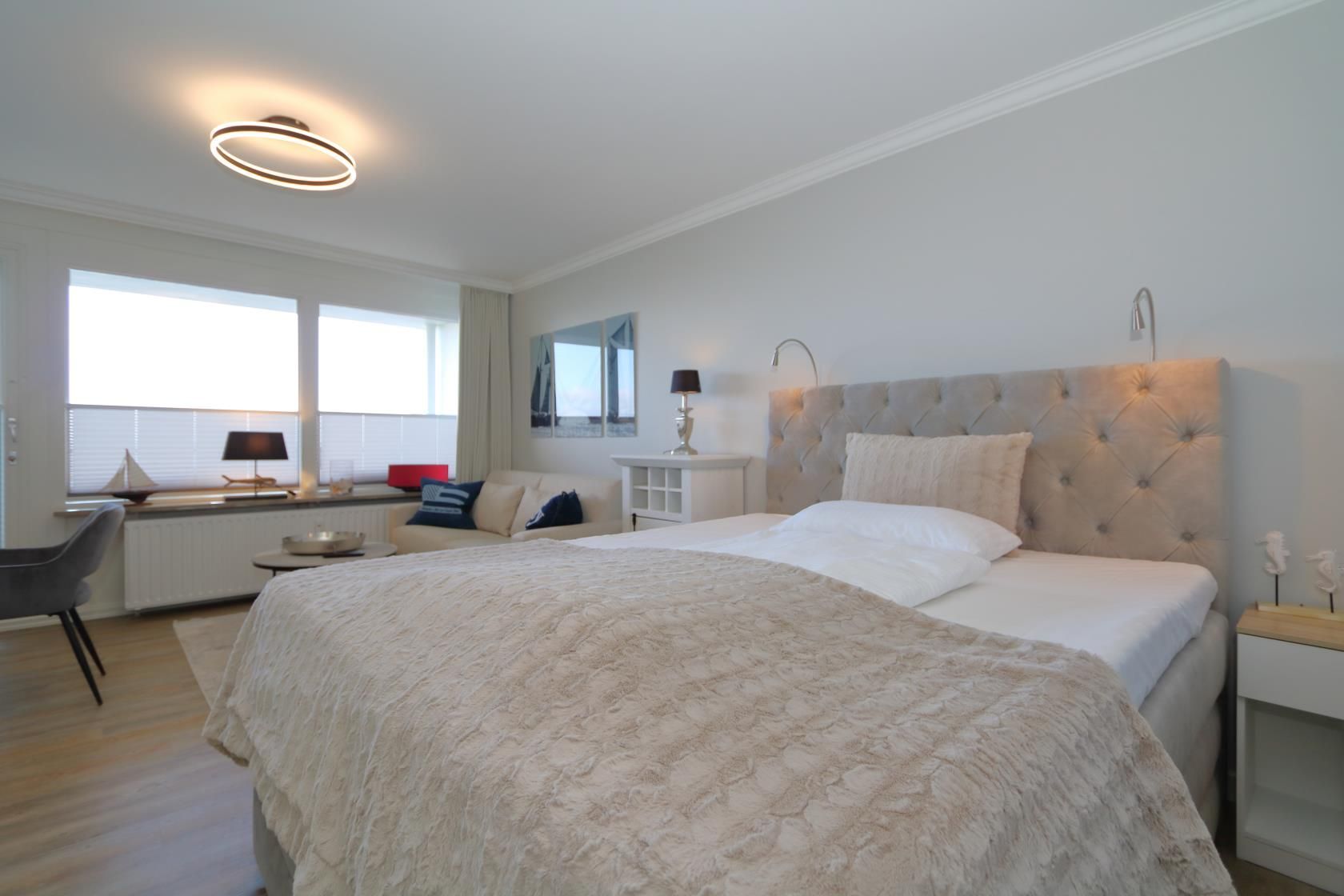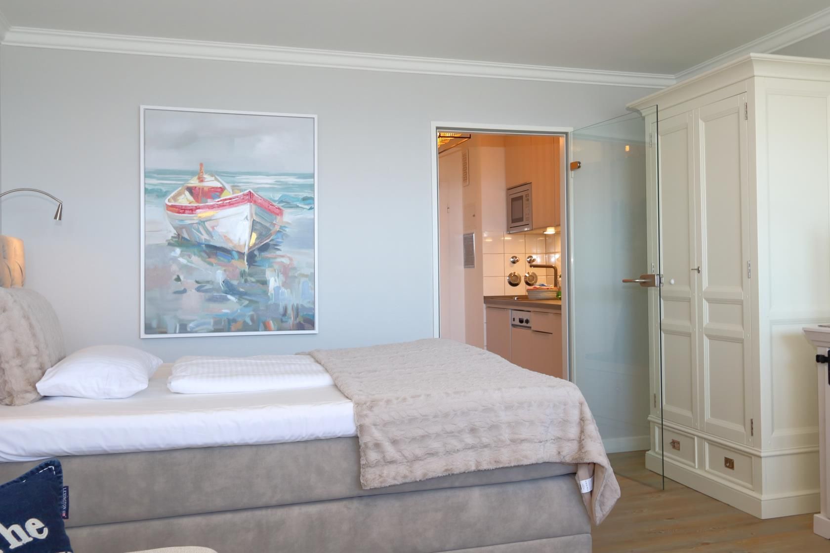 Das Appartement ist großzügig ausgestattet mit u.a. einem festen Boxspringbett, und Westbalkon, moderner Küchenzeile im Flur und ein Badezimmer mit Dusche.