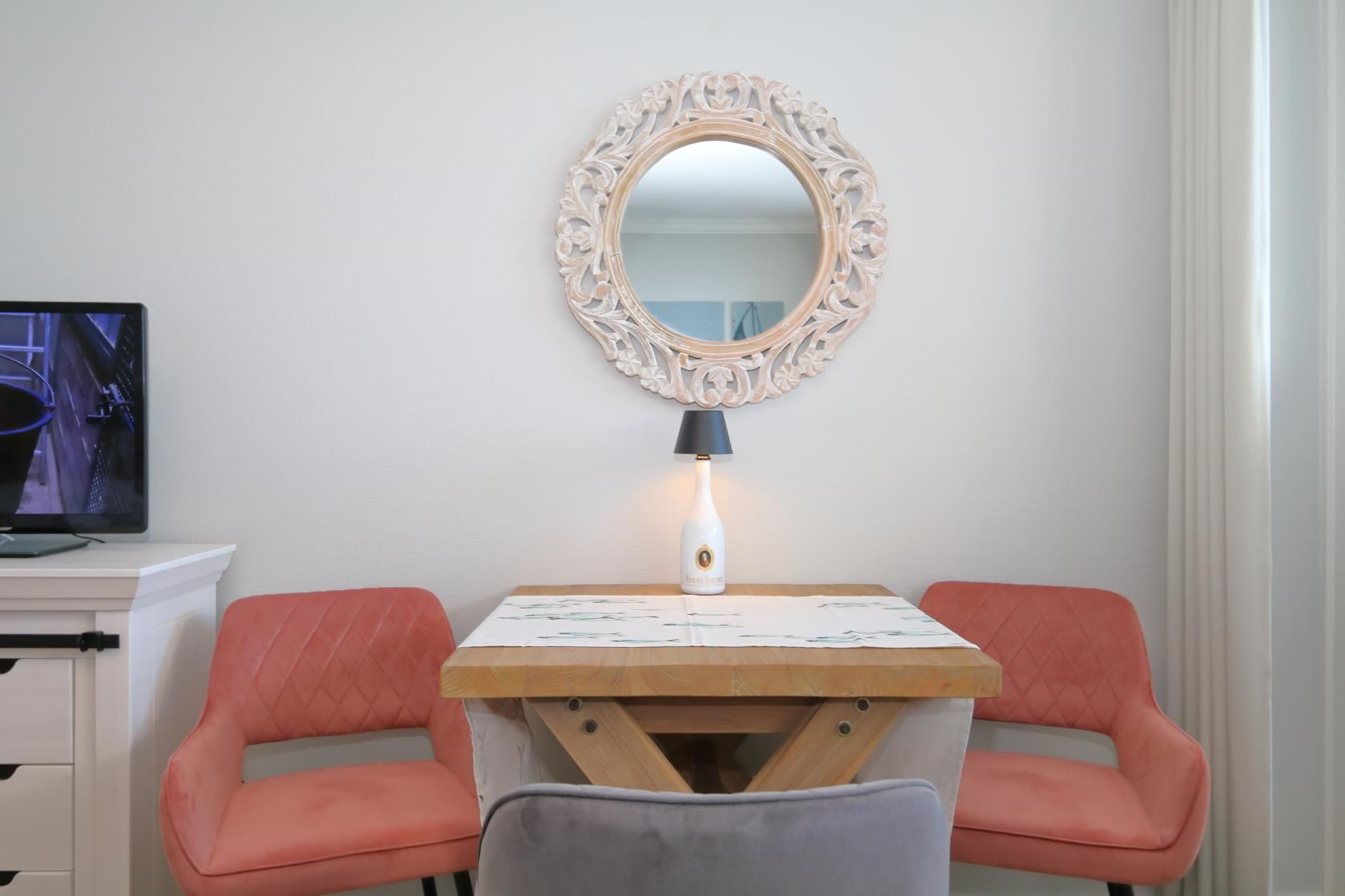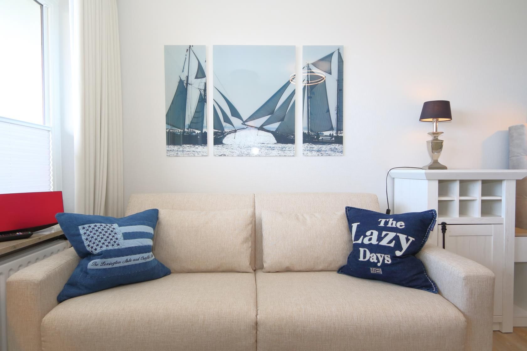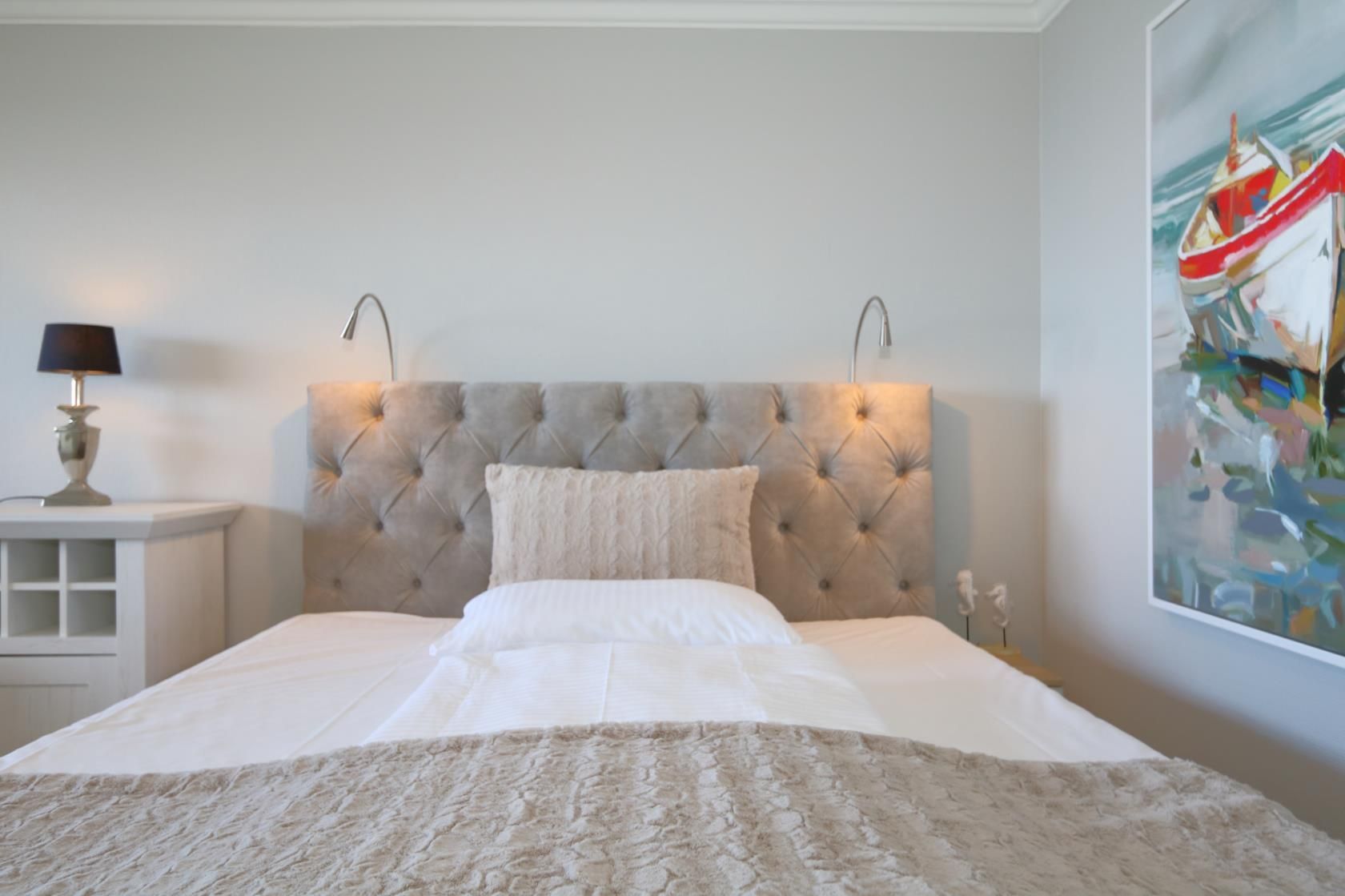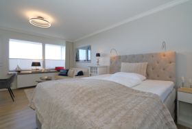 Das Appartement ist großzügig ausgestattet mit u.a. einem festen Boxspringbett, und Westbalkon, moderner Küchenzeile im Flur und ein Badezimmer mit Dusche.