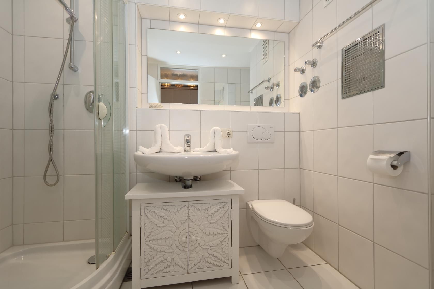 WC, Dusche, Waschbecken, Spiegel und ausreichend Handtücher und Vorleger.