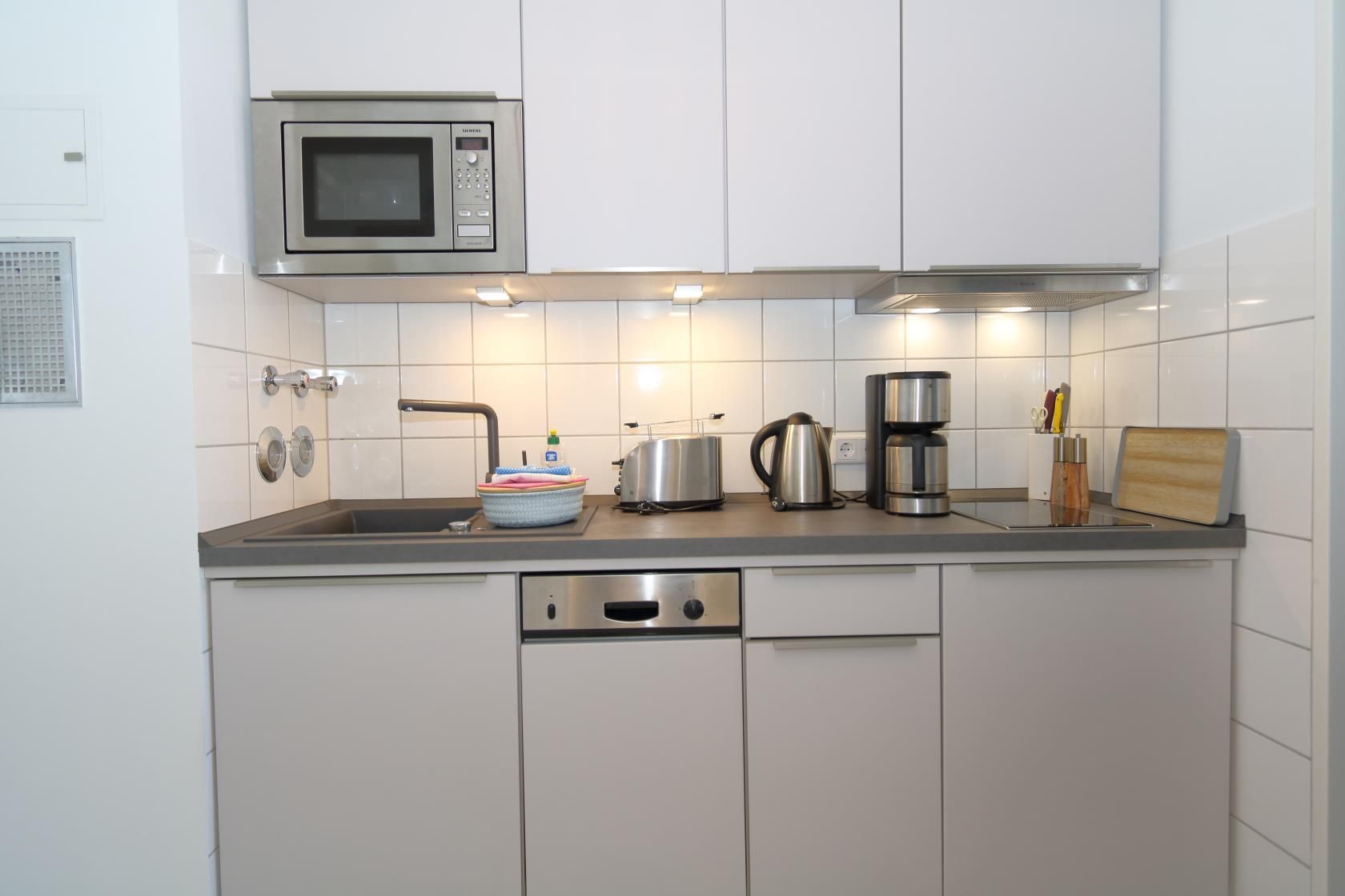Spülmaschine, gängige Küchenutensilien, Herd , Dunstabzugshaube, Wasserkocher, Microwelle, Filterkaffeemaschine, Toaster, Kühlschrank usw