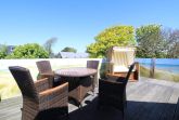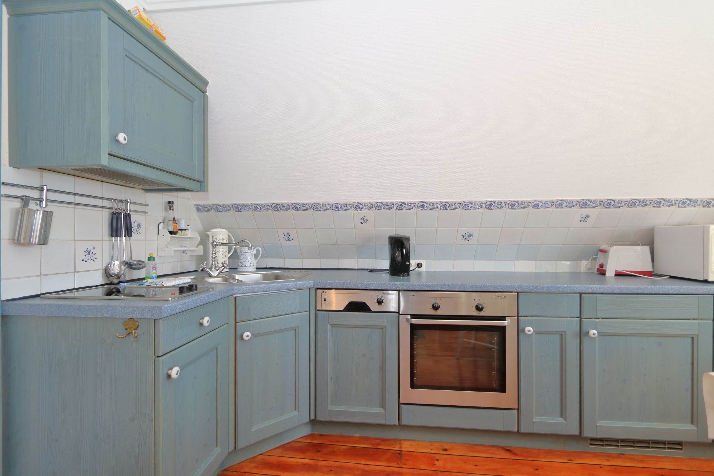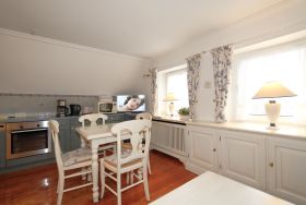 Das Wohnzimmer hat eine bequeme Couchgarnitur, die auch als Schlafgelegenheit dienen kann. Die im Wohnzimmer untergebrachte Küchenzeile ist komplett ausgestattet. Die gesamte Wohnung ist im Laura Ashley Stil eingerichtet und hat viele liebevolle Details. Vom Schlafzimmer mit dem Doppelbett gelangt man auf die uneinsehbare Dachterrasse mit Balkonmöbeln und Strandkorb. Im Bad mit Dachfenster ist eine Dusche.