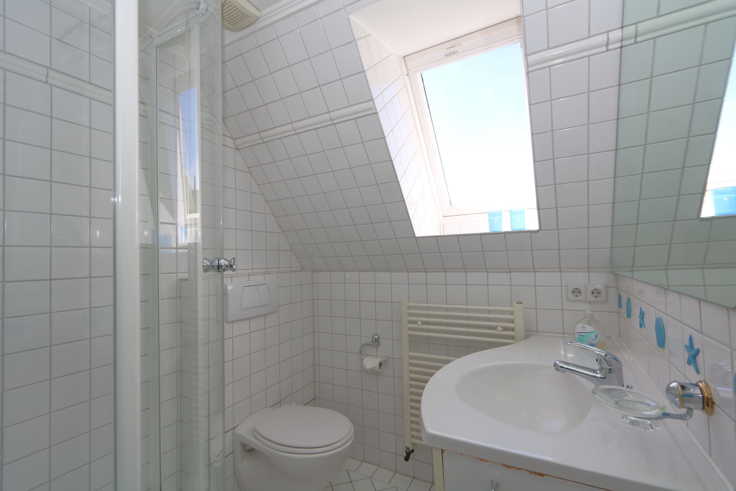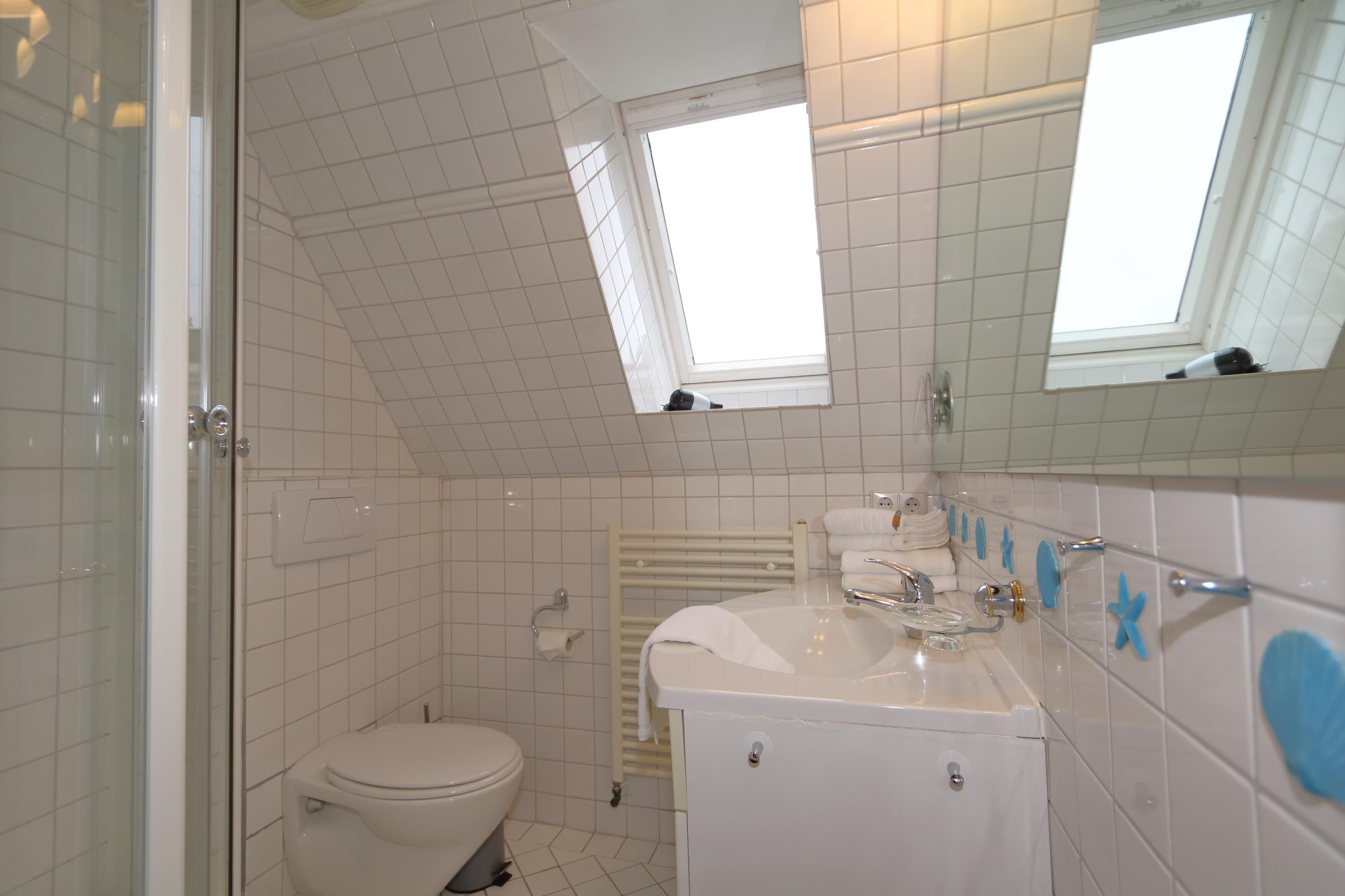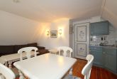 Das Wohnzimmer hat eine bequeme Couchgarnitur, die auch als Schlafgelegenheit dienen kann. Die im Wohnzimmer untergebrachte Küchenzeile ist komplett ausgestattet. Die gesamte Wohnung ist im „Laura Ashley“ Stil eingerichtet und hat viele liebevolle Details. Vom Schlafzimmer mit dem Doppelbett gelangt man auf die uneinsehbare Dachterrasse mit Balkonmöbeln und Strandkorb. Im Bad mit Dachfenster ist eine Dusche.