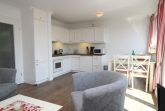 Das Wohnzimmer hat zur Südseite Fenster und einen kleinen Südbalkon. Im Wohnzimmer stehen die Sitzgarnitur und der Essplatz. Ebenfalls ist dort die Küchenzeile vorhanden. Das Duschbad ist Innen liegend. In beiden Schlafzimmern stehen Doppelbetten.