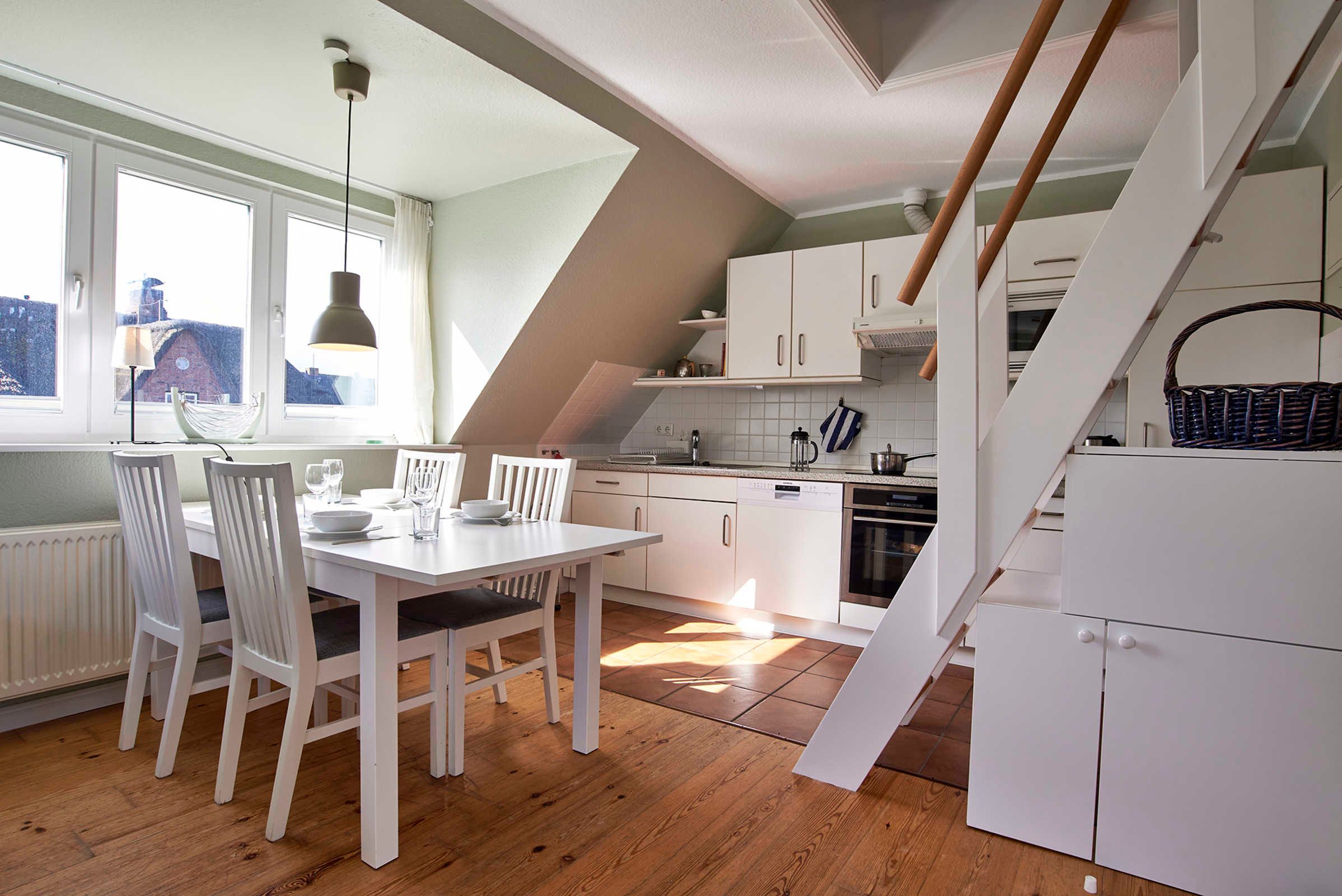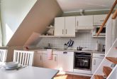 Vom Gemeinschaftseingang des Hauses gelangen Sie über eine Treppe zu Ihrem eigentlichen Urlaubsdomizil. Es stehen Ihnen ein helles, großzügiges Wohnzimmer mit Essgruppe und moderner Einbauküche, ein Schlafzimmer mit Doppelbett und ein Duschbad/WC zur Verfügung.