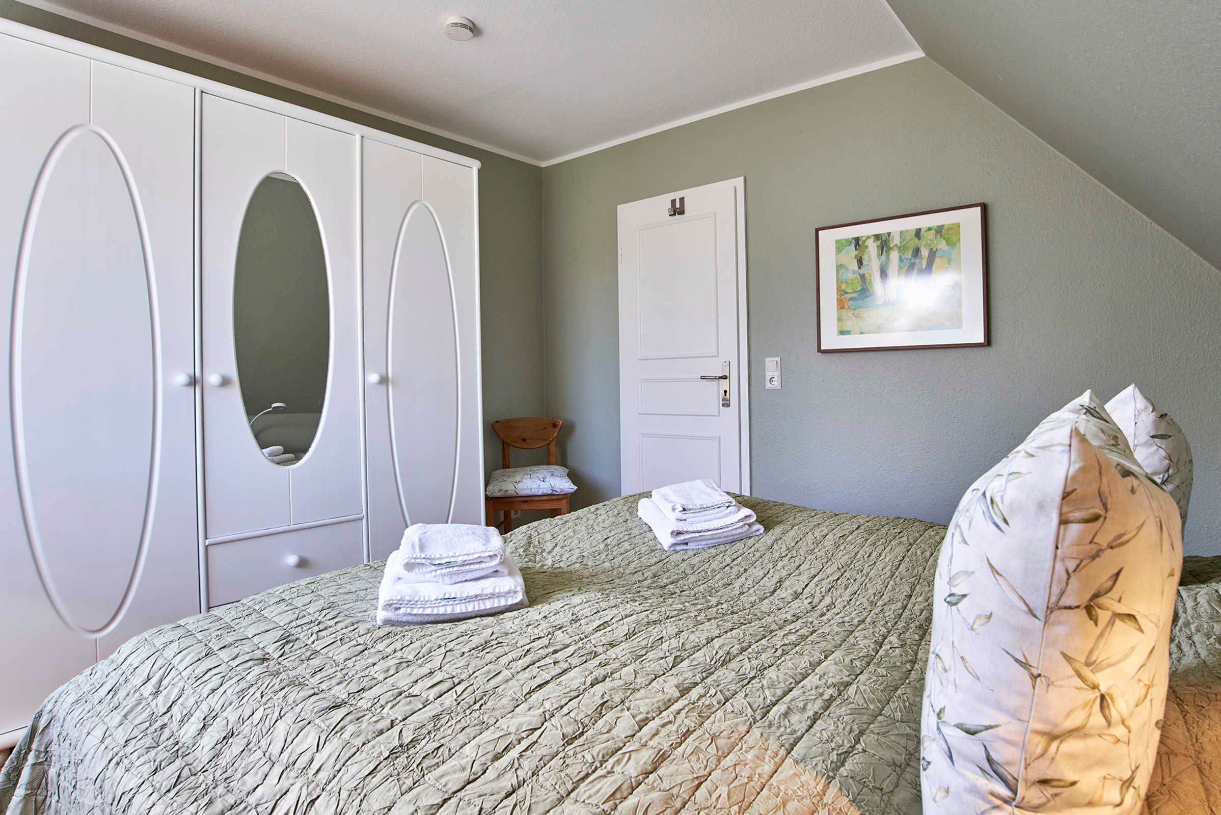 Auf dem Schlafzimmerschrank finden Sie Polster für die Gartenmöbel, die in einer geschützten Sitzecke im Garten exklusiv für diese Wohnung auf Sie warten. In der Küche steht ein Picknickkorb für den Garten bereit.