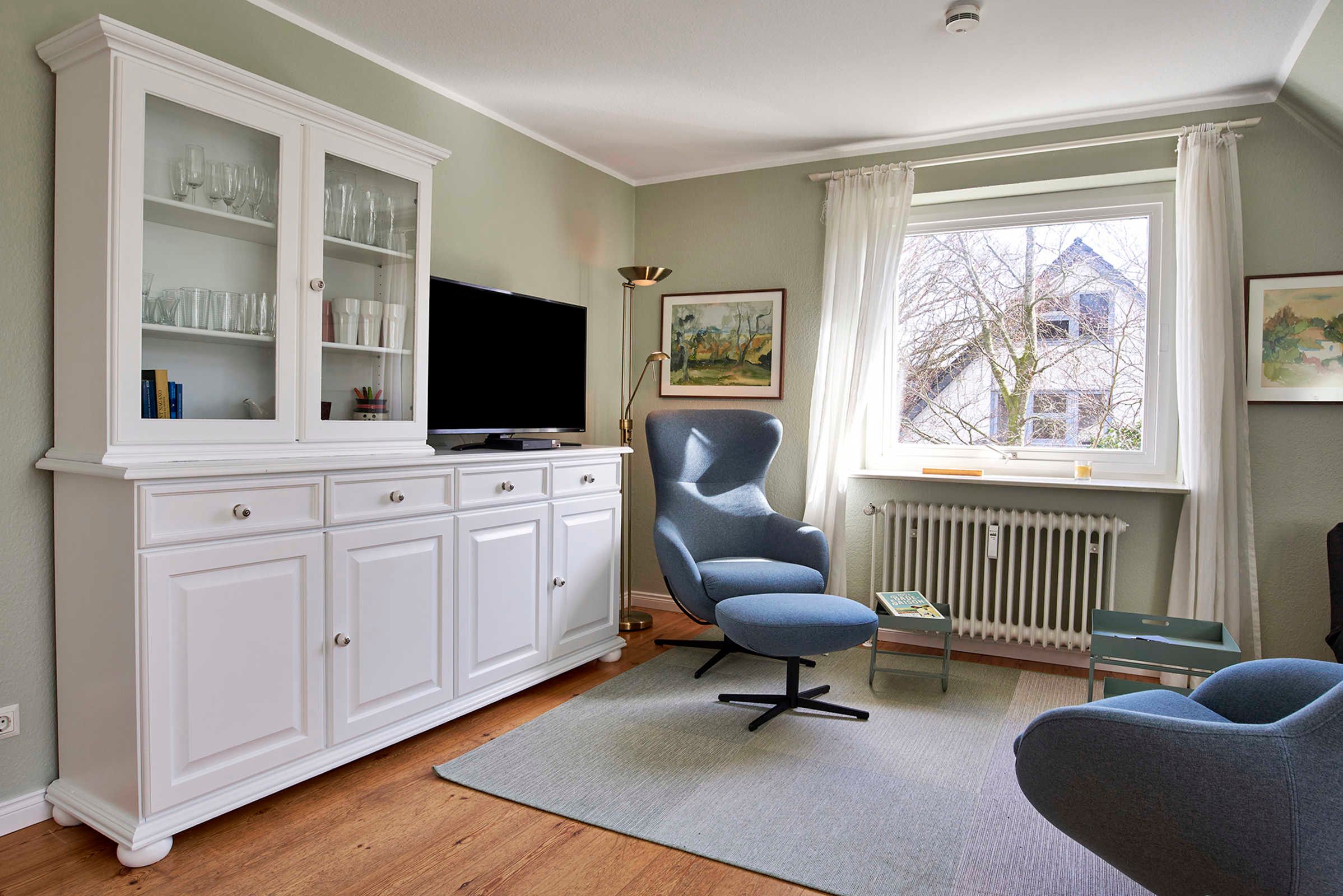 Diese Wohnung bietet eine ungewöhnliche Mischung: Mitten in Nieblum gelegen, aber in absoluter Ruhe, weil in zweiter Reihe fernab von Straßen, umringt nur von pittoresken Reetdachhäusern, aber nur wenige Schritte zum Dorfteich und 800 m vom Strand entfernt. Sie ist ca. 70 qm groß und bietet Platz für 2 Personen. Die Wohnung wurde 2021 umfangreich und mit viel Liebe zum Detail renoviert, neu möbliert und hochwertig ausgestattet. Diskrete Designermöbel warten auf Liebhaber ausgedehnter Lese-Abende. Für moderne Unterhaltung sorgen ein NanoCell Smart-TV von LG (2021), Wlan und ein DVD/Blueray/CD-Player. Im Schlafzimmer sorgen sehr hochwertige Matratzen, Lattenroste und eine Kissenbar für perfekten Schlaf.