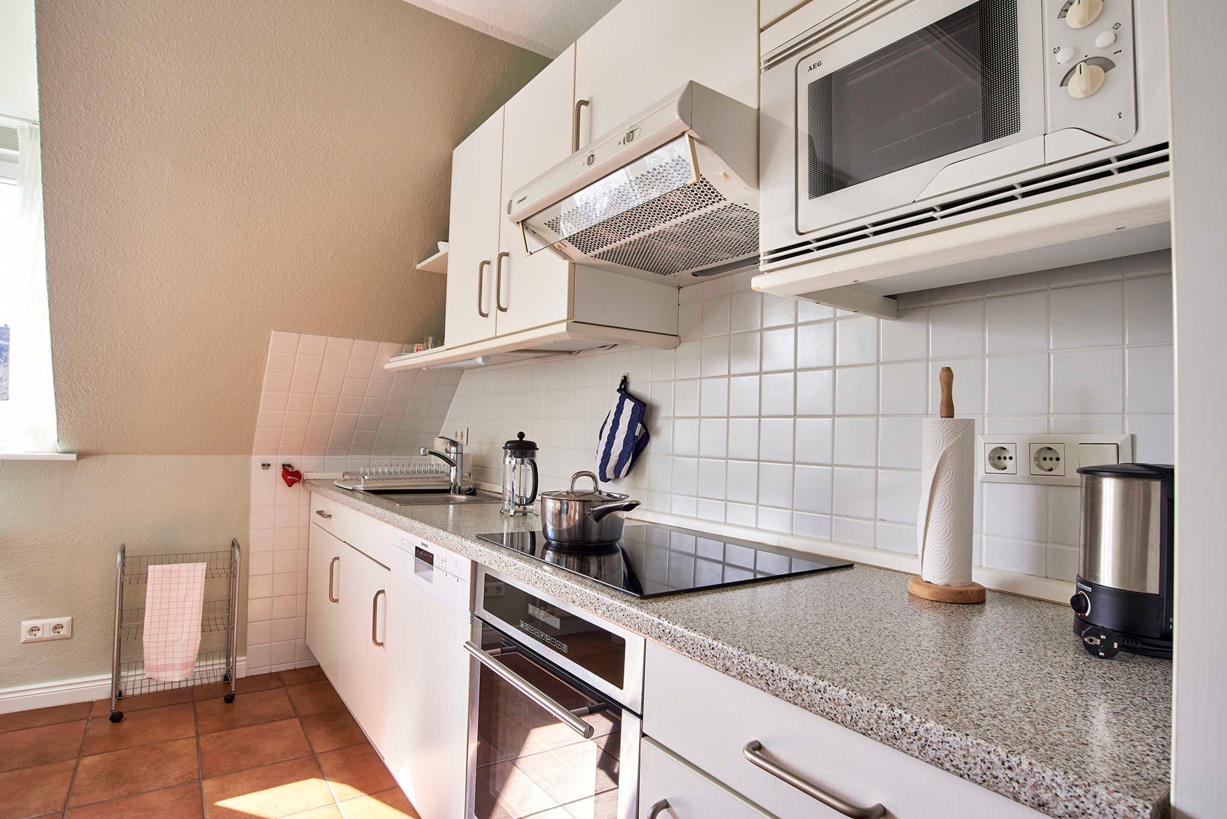 In der modernen, voll ausgestatteten Küche finden Sie unter anderem Induktionsherd mit Backofen, Kühlschrank mit Gefrierfach, Mikrowelle, Geschirrspüler, WMF-Smoothie-Mixer, Nespresso-Maschine, Filter-Kaffeemaschine, Wasserkocher, Toaster, Handrührer sowie allerlei Pütt und Pann zum Kochen und Backen. Geschirr und Besteck sind für 8 Personen vorhanden. Im Wohnzimmerschrank finden Sie eine große Auswahl neuer, hochwertiger Gesellschaftsspiele, für Entspannungstraining sorgt eine Yogamatte mit blöcken und gurt.