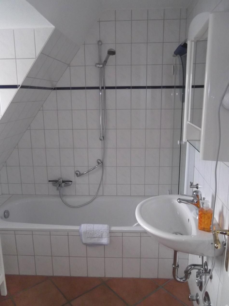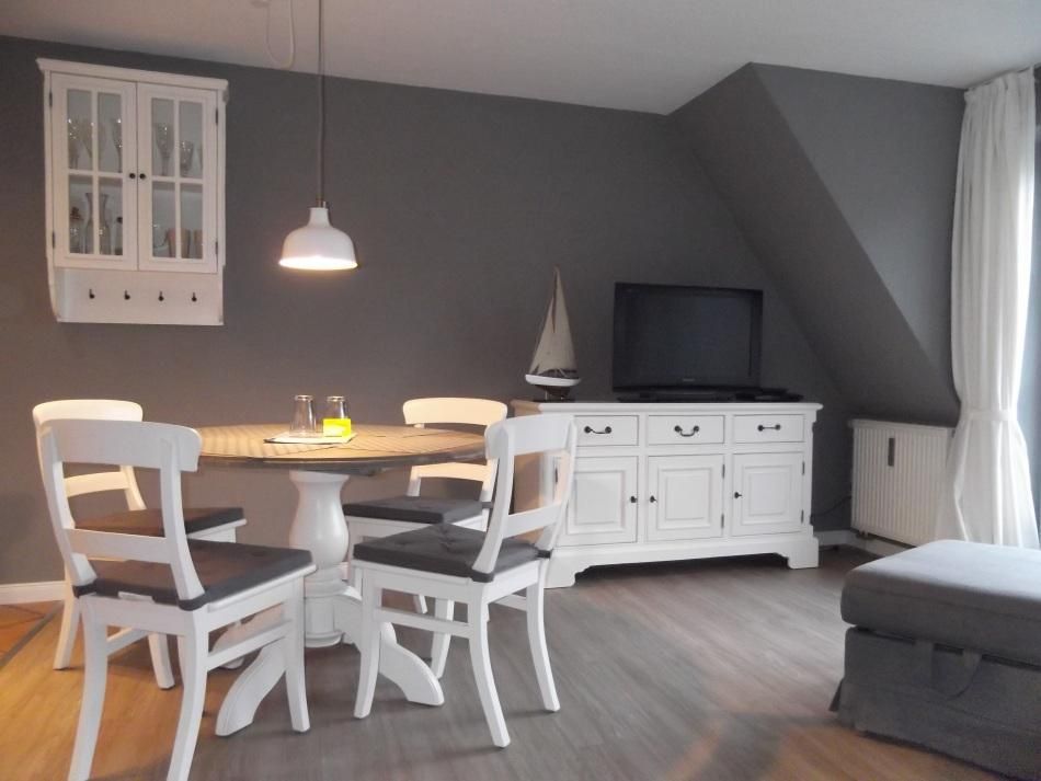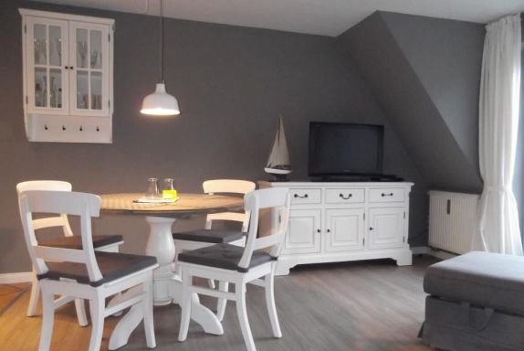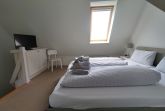 Auf der ersten Etage befinden sich das Wohnzimmer mit Essplatz, die separate Küche und das Wannenbad mit Duschabtrennung. Vom Wohnzimmer gelangt man direkt zum südwestlich gelegenen Balkon. Vom Flur aus erreichen Sie über die Treppe das Schlafzimmer mit Doppelbett und einem zweiten Fernseher. Im Giebel befindet sich eine 3. Schlafmöglichkeit.