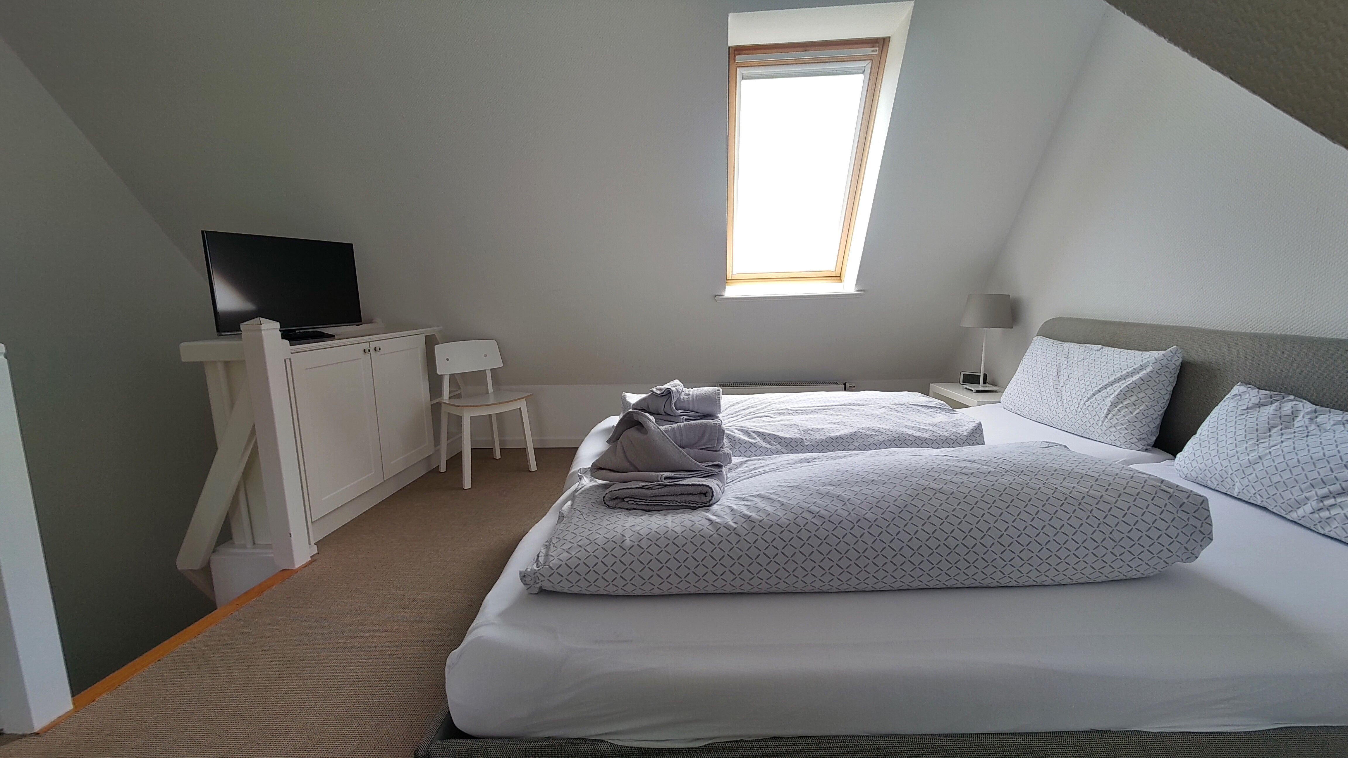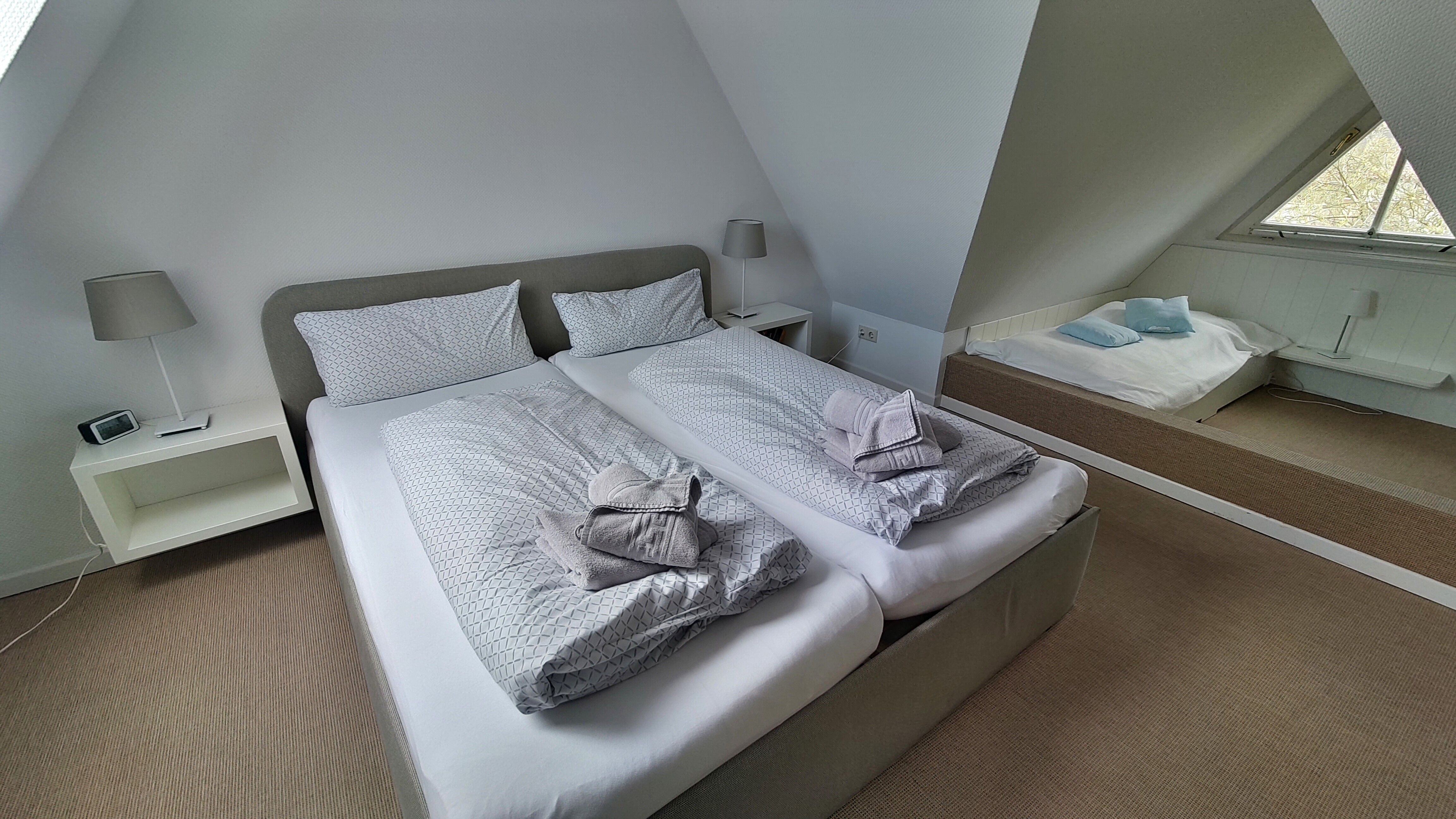 Die Raumaufteilung ist wie folgt: 1 Schlafraum mit Doppelbett und Einzelbett im Giebel, 1 Wohnküche, 1 Badezimmer mit Badewanne.