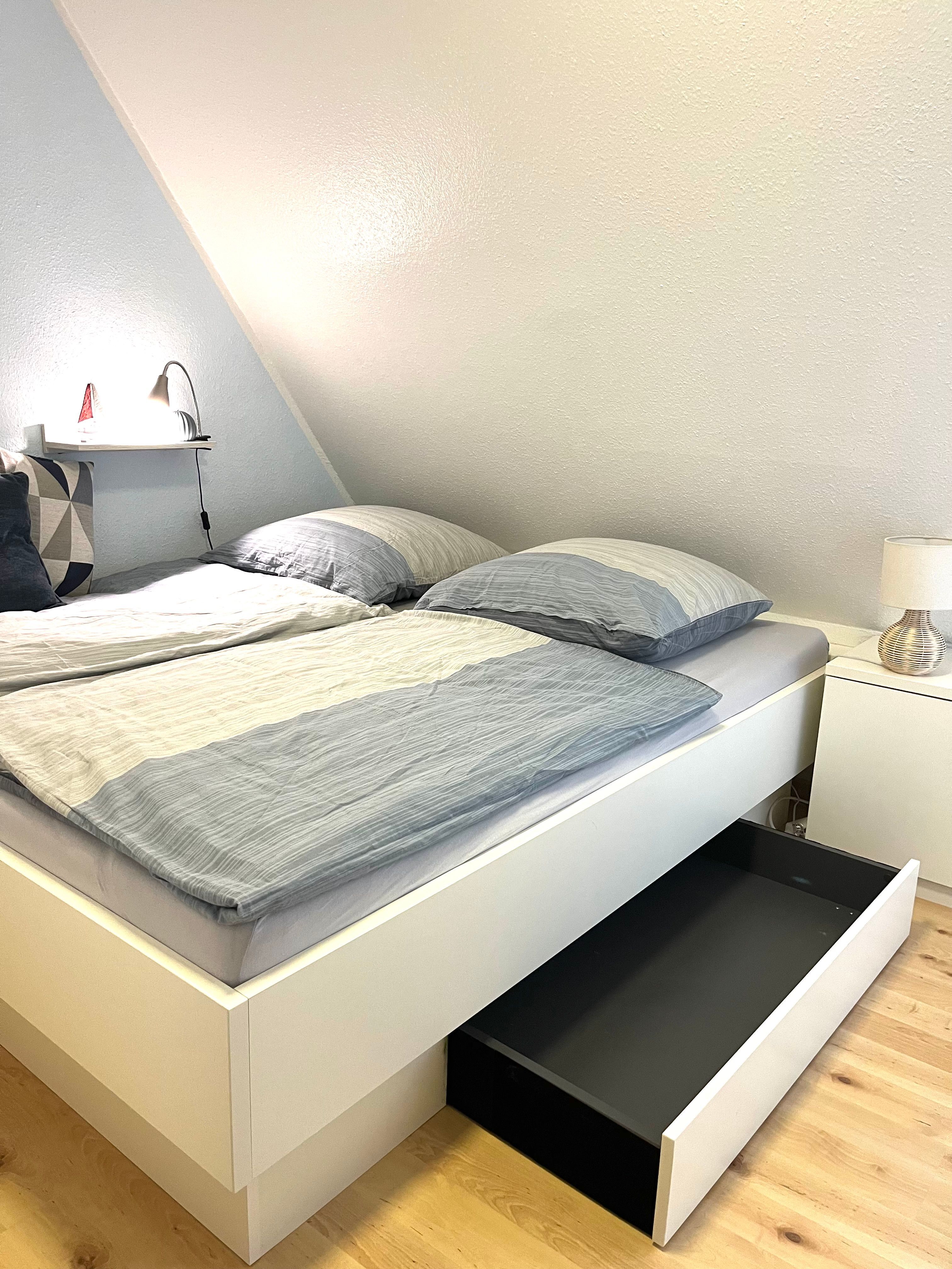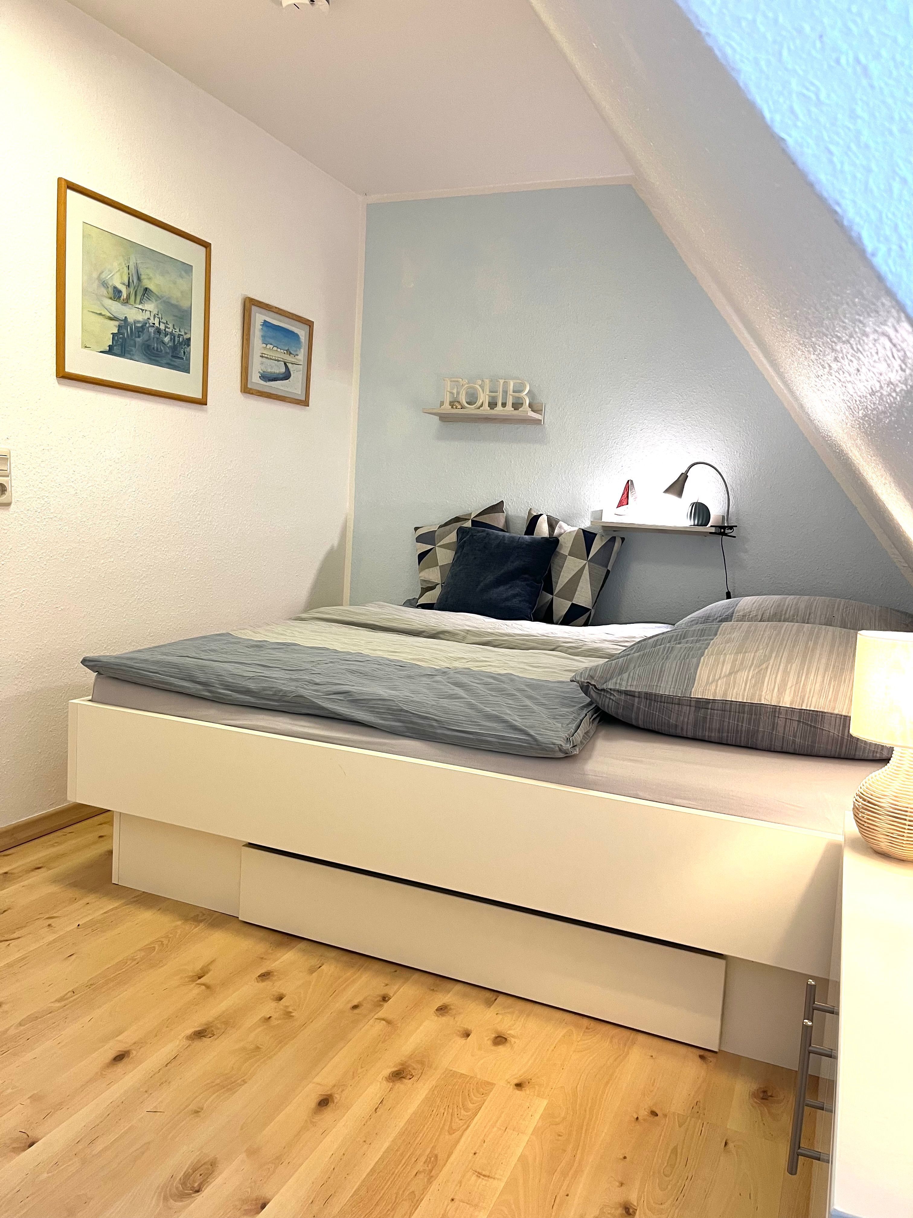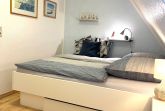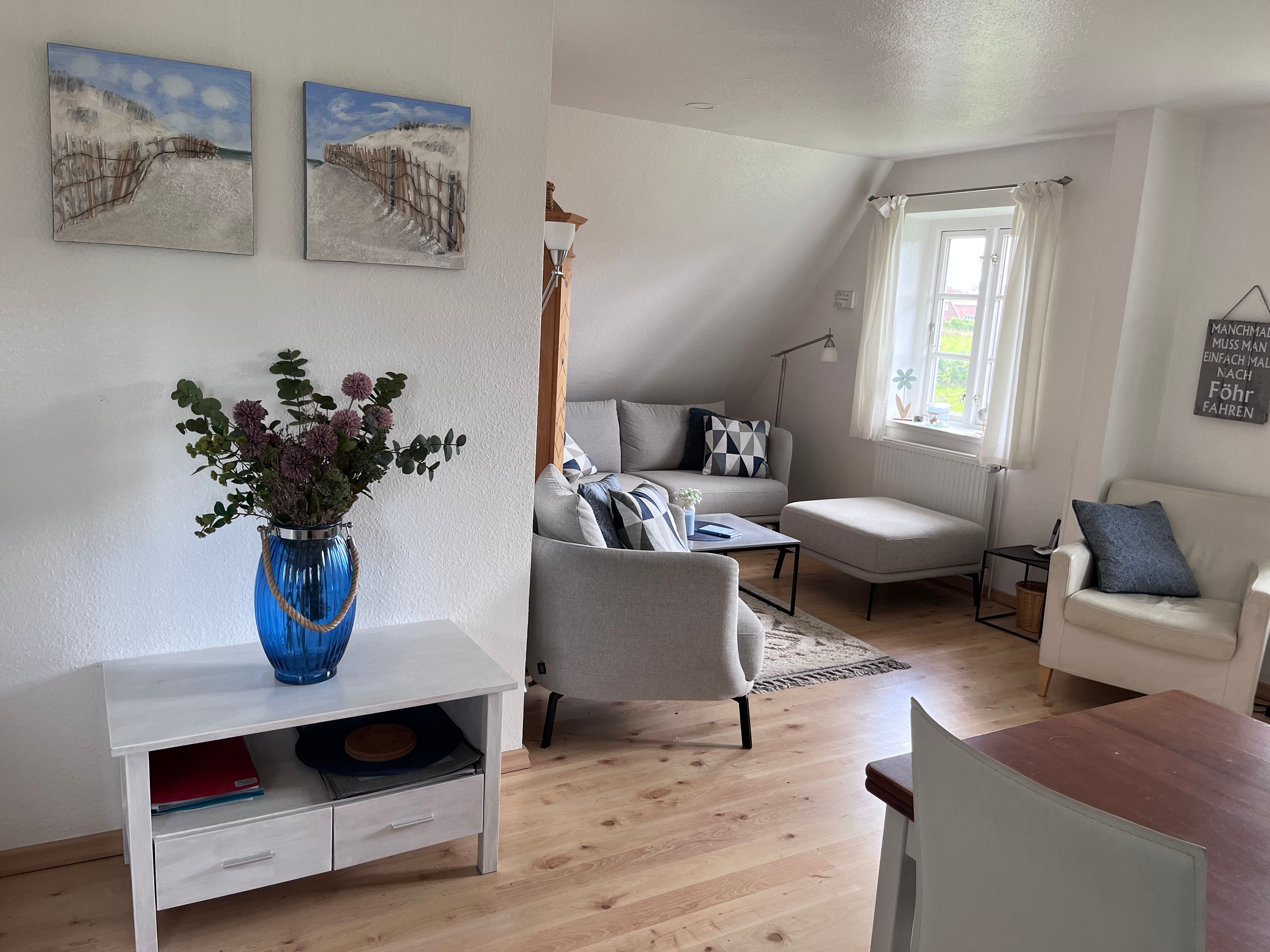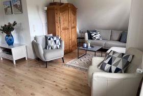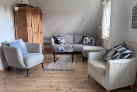 Diese gemütliche, hell eingerichtete Ferienwohnung unter Reet bietet Platz für zwei bis vier Personen. Die Obergeschosswohnung ist ca. 50m² groß. Die beiden Schlafzimmer sind mit zwei Einzelbetten ausgestattet, in einem Schlafzimmer können die Betten zu einem Doppelbett zusammengestellt werden. Das Wohnzimmer mit einer integrierten Küche lädt zum gemeinsamen Kochen ein. Ein Duschbad ist vorhanden. Ein schöner Außensitzplatz mit Strandkorb gehört zur Ferienunterkunft dazu. Natürlich ist auch ein PKW-Stellplatz direkt am Haus vorhanden.