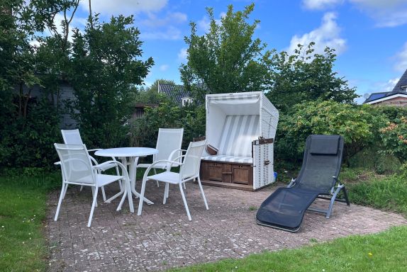 Außenbereich: Strandkorb auf Terrasse, Terrasse, Parkplatz.