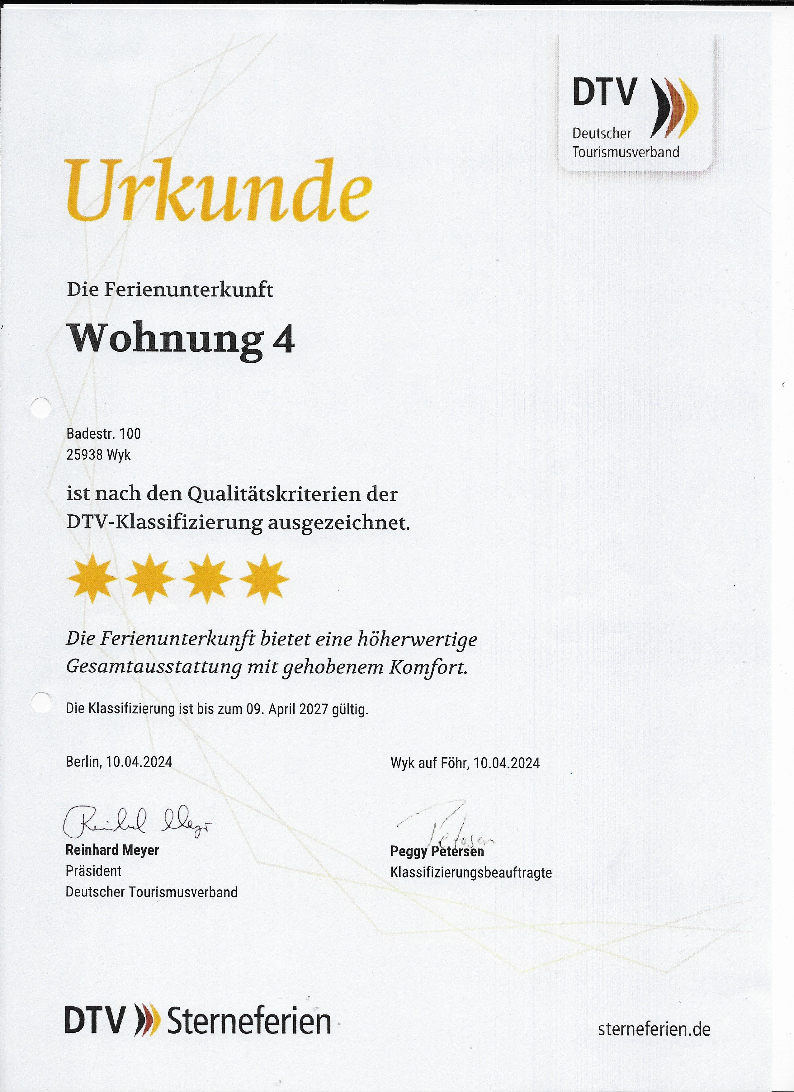 Die Ferienunterkunft wurde nach den Qulaitätskriterien der DTV-Klassifizierung mit 4 Sternen ausgezeichnet.