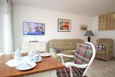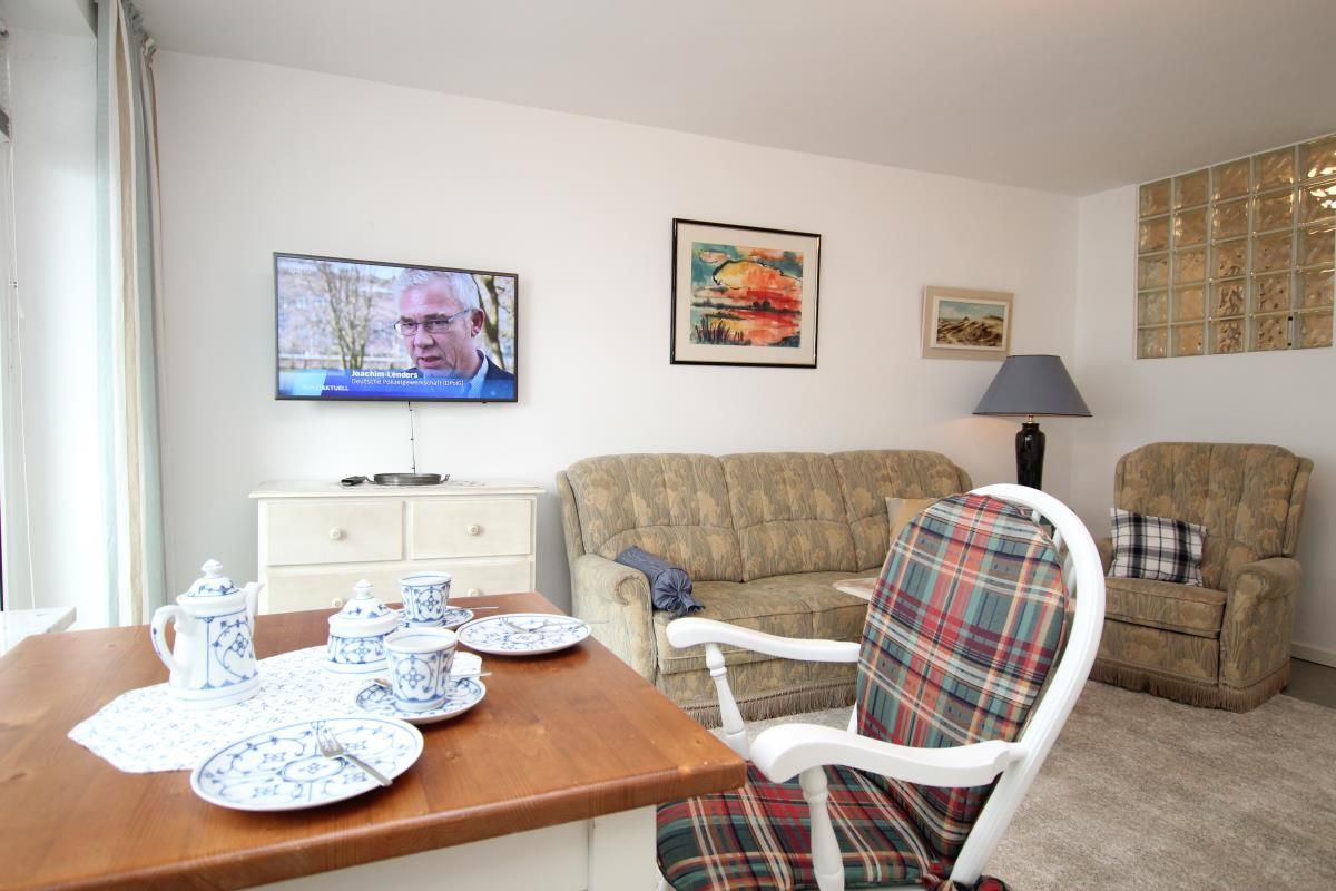 Im Wohnzimmer stehen eine Couchgarnitur und vor dem Fenster der Essplatz. In einer weißen Schrankwand sind zwei nebeneinander stehende einzeln aufklappbare Schrankbetten untergebracht. Die kleine Küche ist vom Wohnzimmer getrennt. Vom Balkon kann man seitlich das Meer hinter der Sylter Welle sehen. Das Bad hat eine Dusche. Das Appartement ist mit WLan und Telefon (ins deutsche Festnetz) ausgestattet.