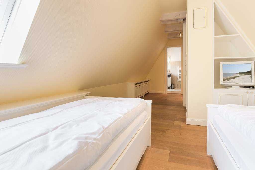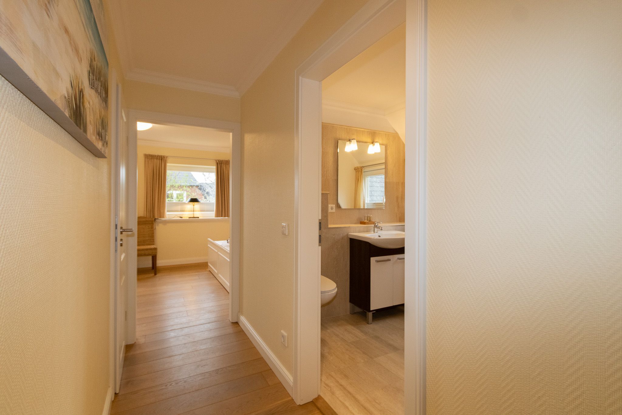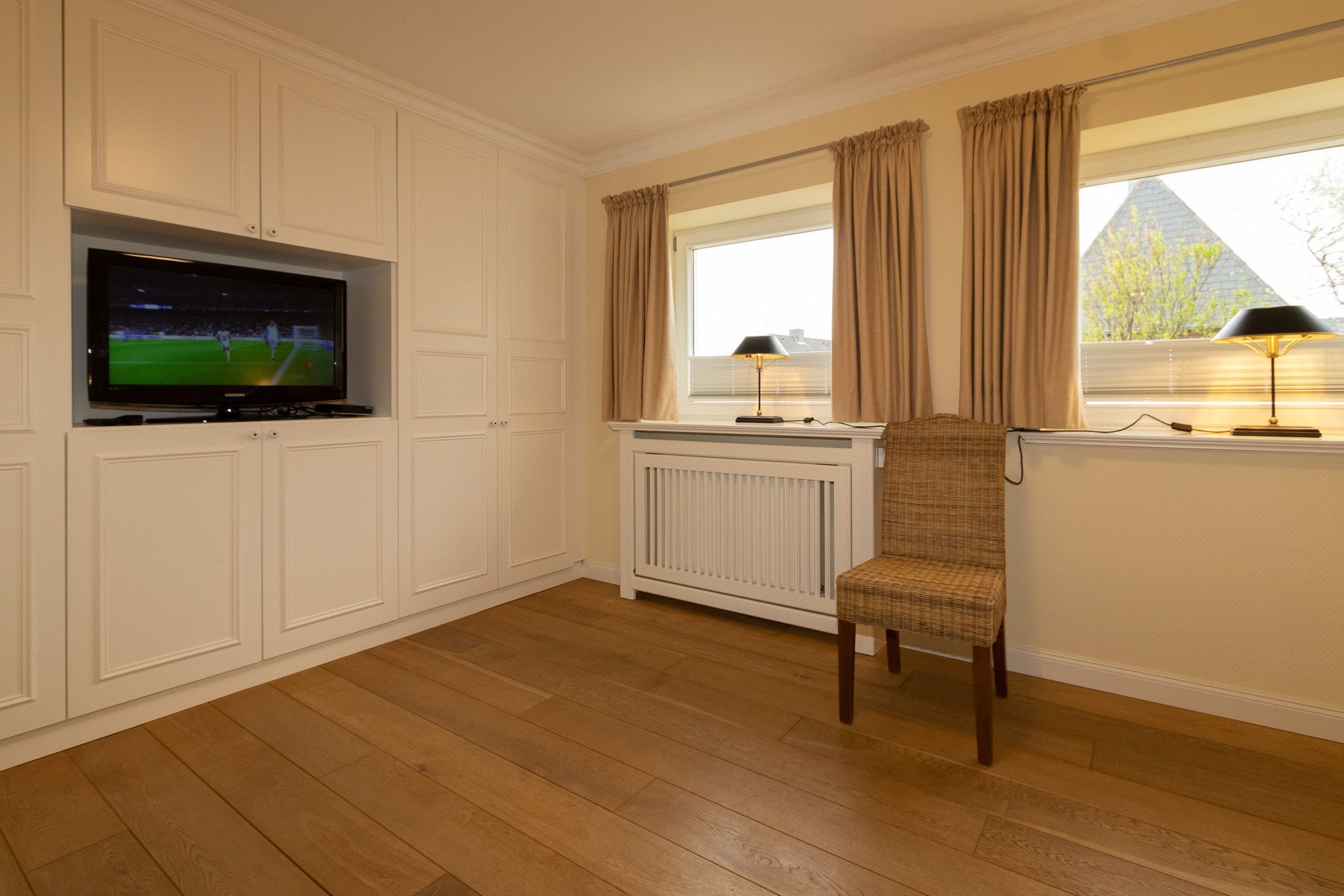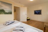 Die exklusive Haushälfte Golfhouse 1, die in 2012 komplett renoviert wurde, befindet sich in einer ruhigen Seitenstraße in Nähe des Golfplatzes. Auf 145 qm Wohnfläche erwartet Sie eine Hohe Qualität an stimmiger Einrichtung, zahlreichen Maßeinbauten und hochwertige Echtholzdielen. Ihr eigener Parkplatz, befindet sich direkt vor dem Haus. In den drei Schlafzimmern haben Sie Platz zum Schlafen für 6 Personen. Ein Schlafzimmer mit einem großen Doppelbett und ein Schlafzimmer mit einem franz.Bett befinden sich im OG. Ein weiteres Schlafzimmer mit zwei Einzelbetten liegt im DG. Alle Schlafzimmer sind mit weißen Maßeinbauten und jeweils einem eigenen Flachbildschirm ausgestattet.