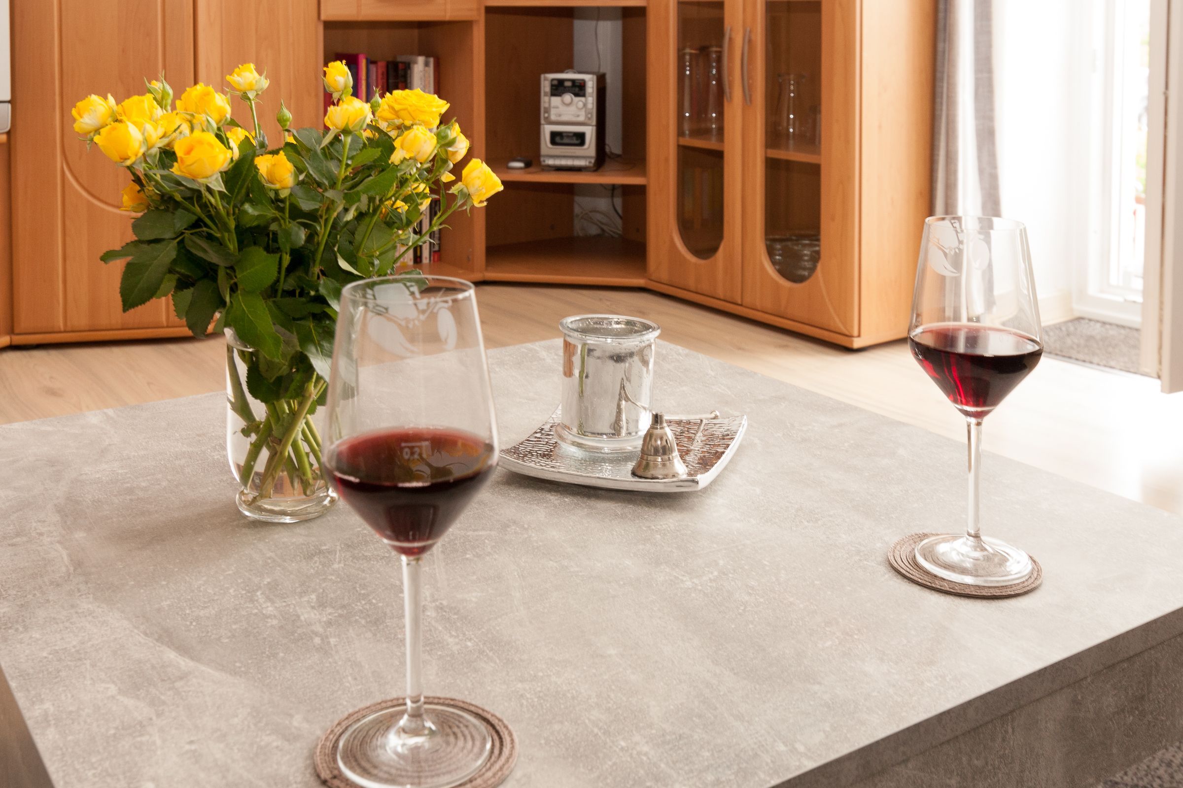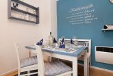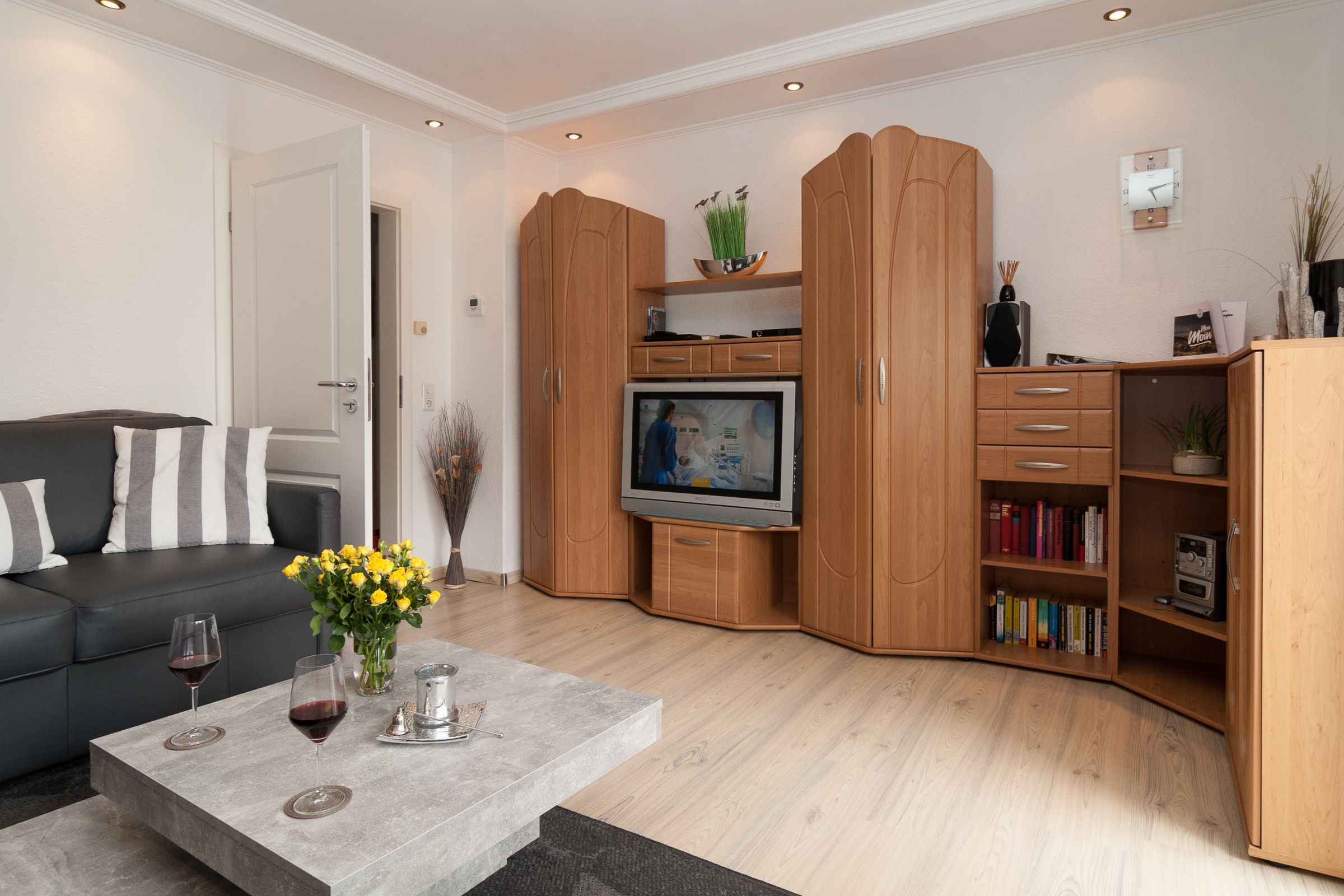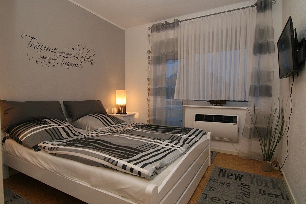 Die Wohnung liegt im Hochparterre und verfügt über ein Wohnzimmer, ein Schlafzimmer mit angrenzendem kleinem Ankleidezimmer, eine Küche mit Essecke und einem neuen Badezimmer. Das Doppelbett im Schlafzimmer ist 1,60m X 2,00m groß und verfügt über zwei Matratzen. Für die dritte und vierte Person befindet sich im Wohnzimmer eine Schlafcouch. Hier empfehlen wir entweder die Wohnung mit 3 Erwachsenen zu nutzen oder 2 Erwachsene und 2 Kinder. Alle Zimmer haben jeweils Außenjalousien vor den Fenstern. Vom Wohnzimmer aus gelangen Sie auf den Balkon mit Terrasse zum Süden.