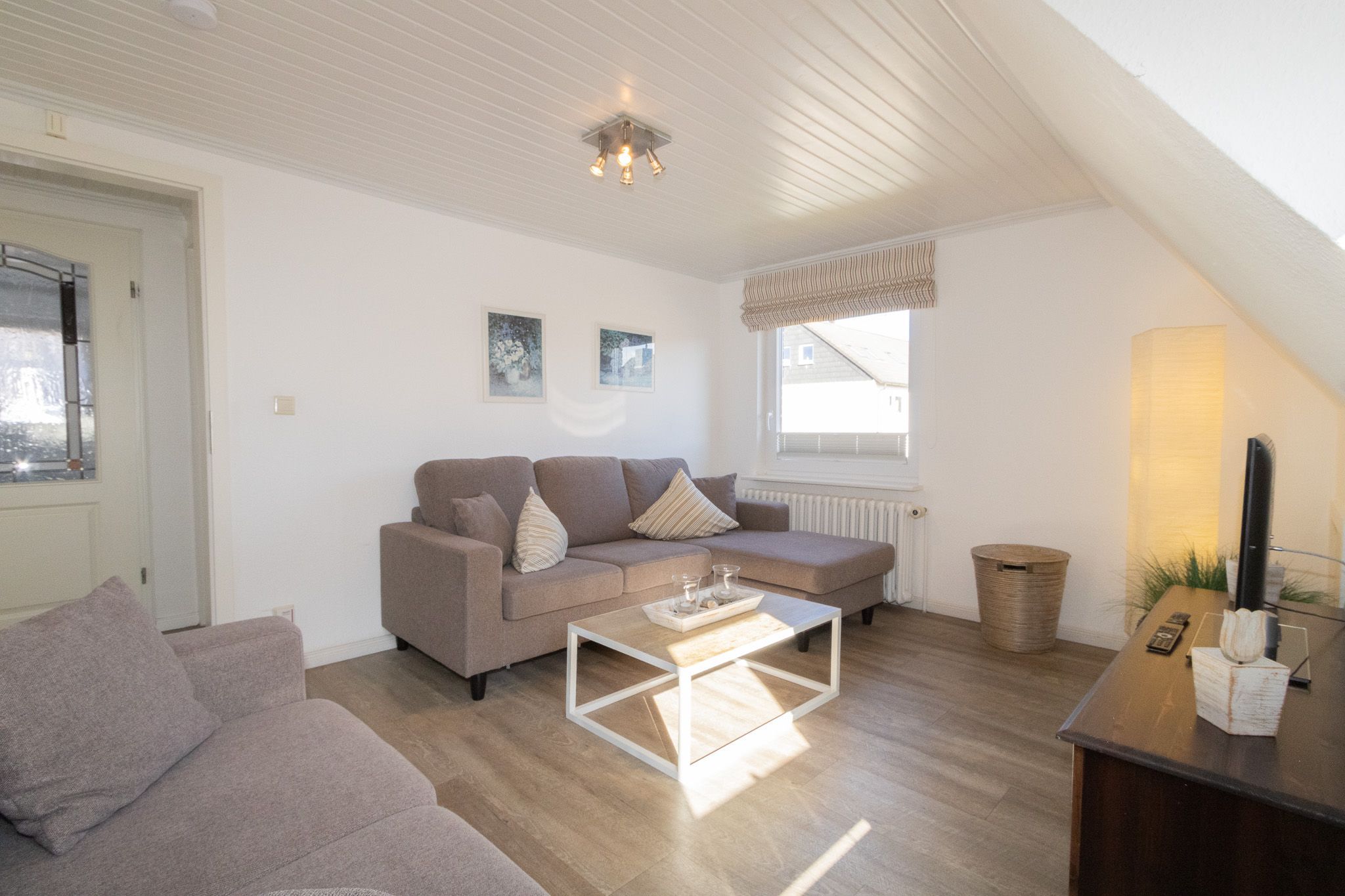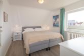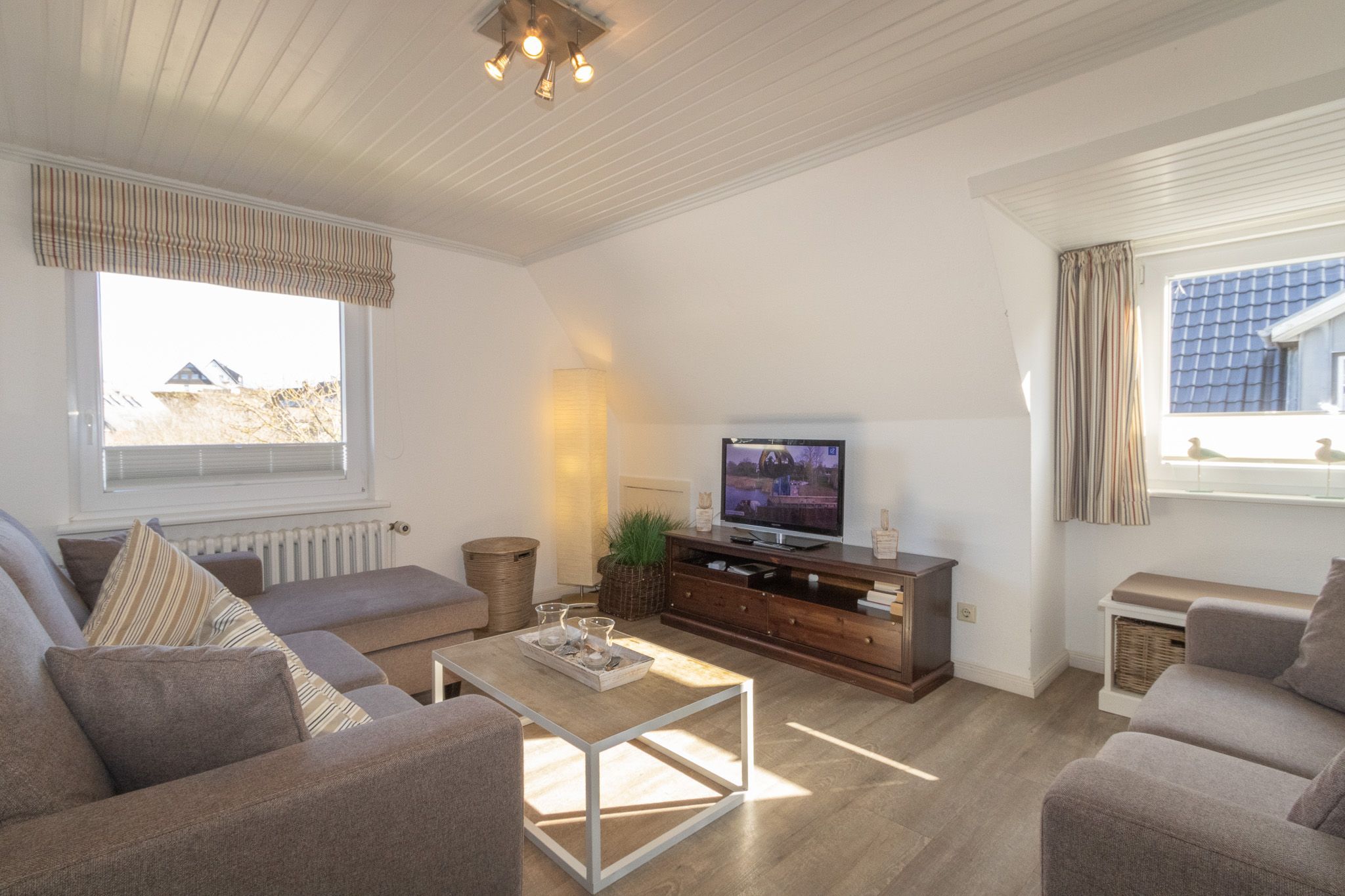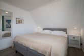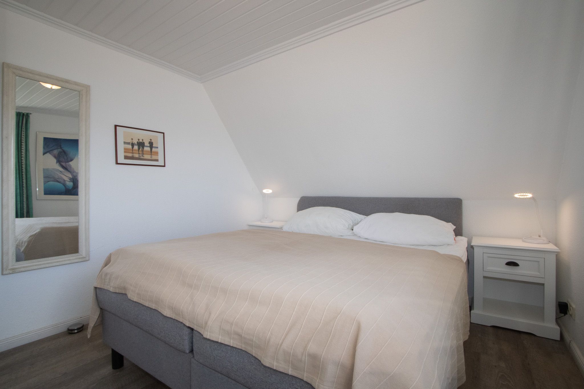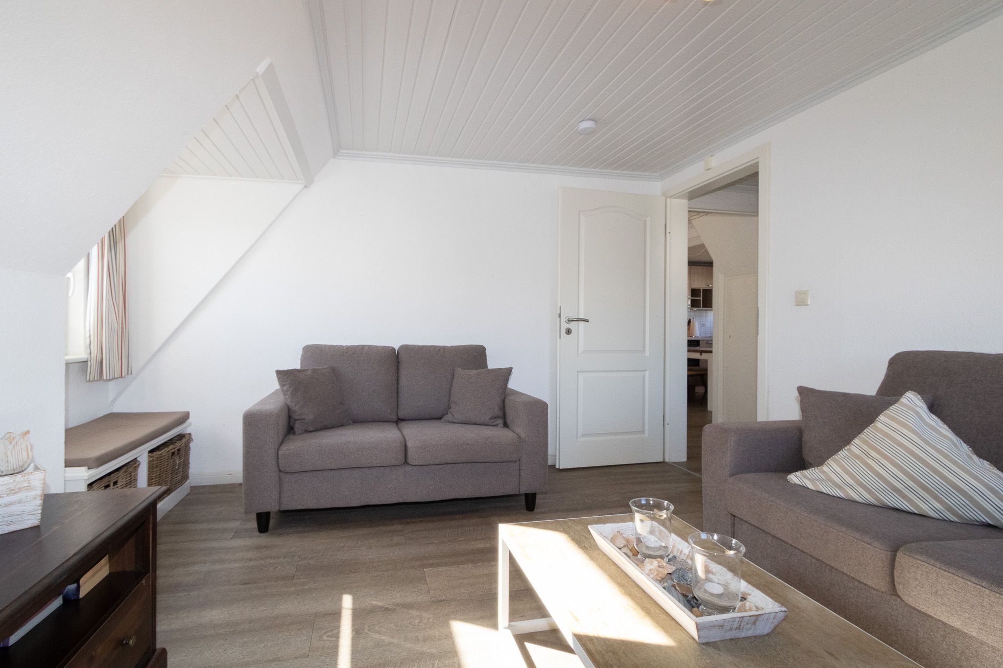 Gepflegtes 5 Zi.-Appartement über OG/DG mit ca. 100 m²; im OG: 1 Wohnzimmer mit Schlafcouch, Tisch, Sidebord und Sat-TV; 1 Schlafzimmer mit Doppelbett und Sat-TV, Ankleidezimmer, Duschbad/WC; 1 Wohnzimmer mit Doppelschlafcouch, Tisch, Couch und Sat-TV; 1 Badezimmer mit Eckbadewanne und WC; Flur mit Gardrobe; separate Einbauküche mit Ceranfeld, Backofen, Mikrowelle, Geschirrspüler, Essplatz für 8 Personen, Radio mit CD-Player, Zugang zur Ost-/Westterrasse mit Bestuhlung; steile Treppe ins DG: 1 Duschbad; 1 separates WC; 1 Schlafzimmer mit Doppelbett und Sat-TV; ein Schlafzimmer mit zwei Einzelbetten.