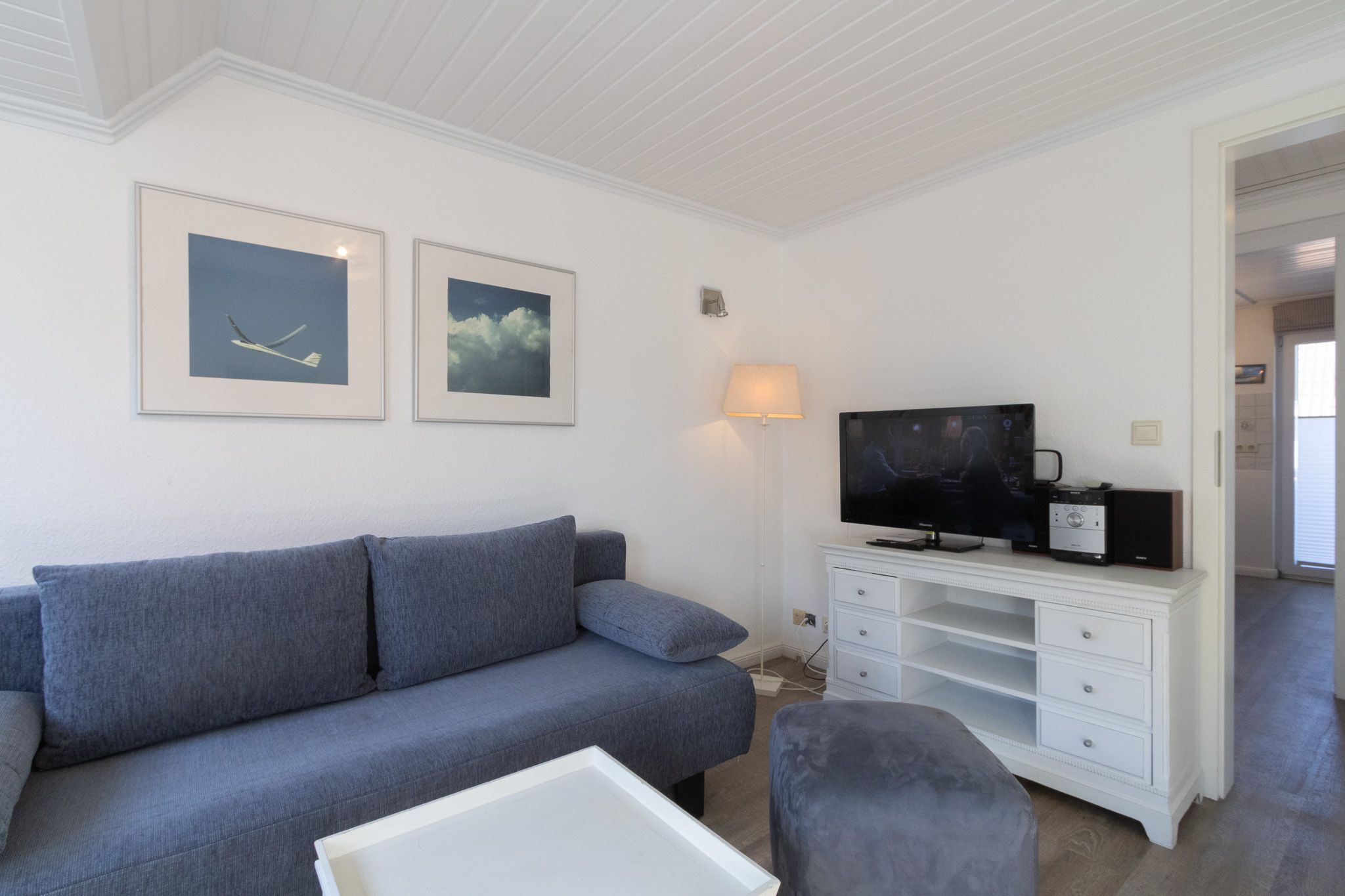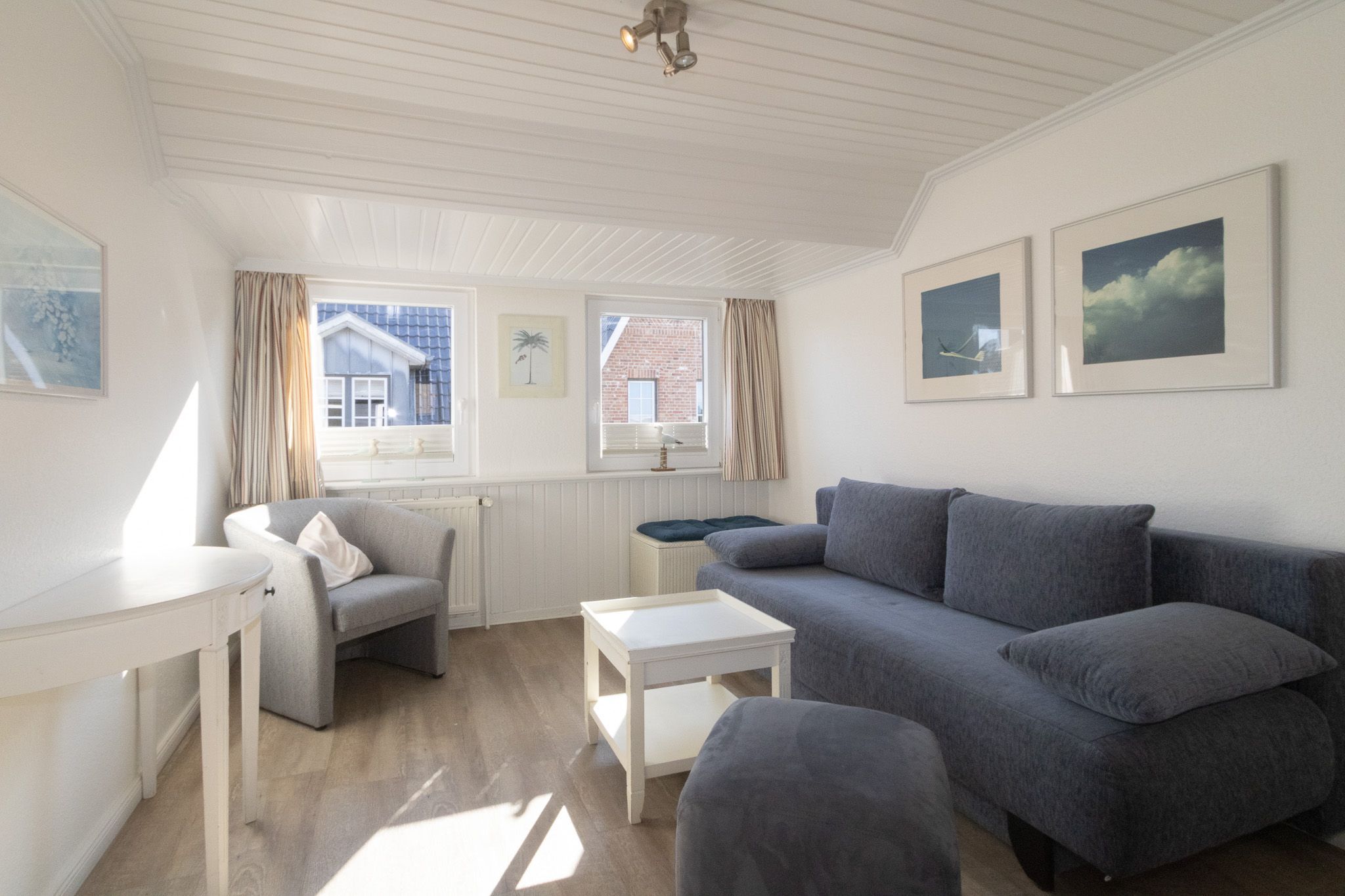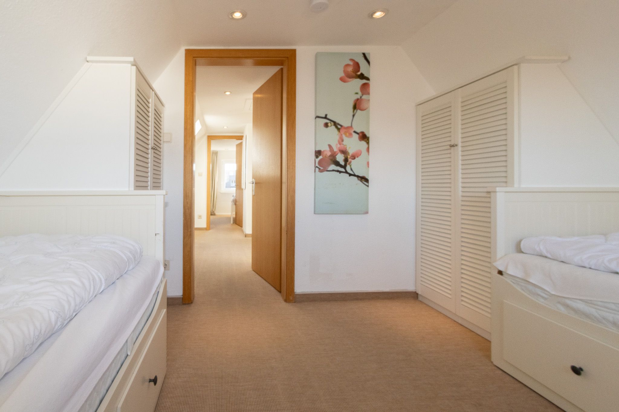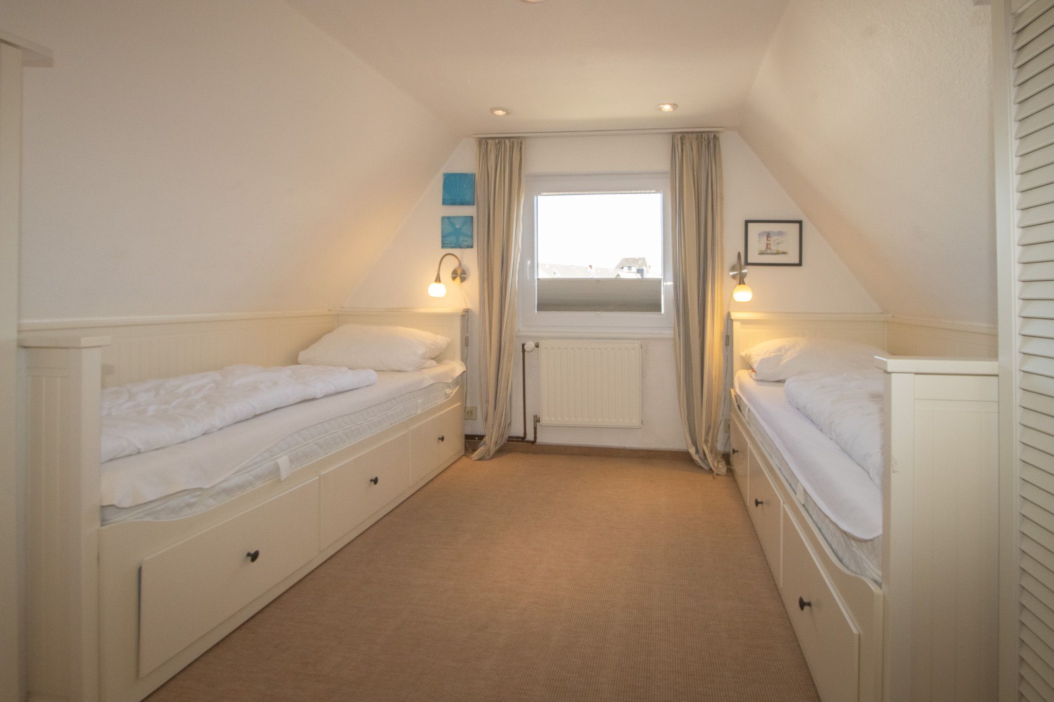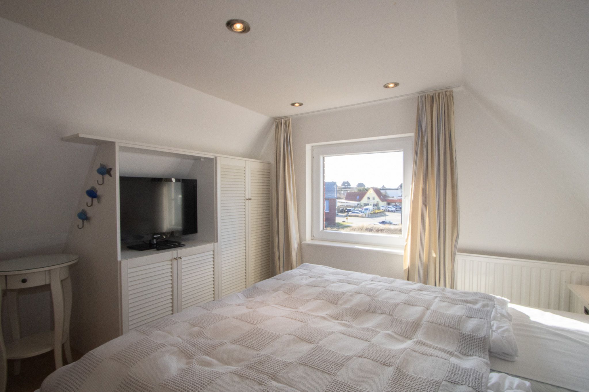 Gepflegtes 5 Zi.-Appartement über OG/DG mit ca. 100 m²; im OG: 1 Wohnzimmer mit Schlafcouch, Tisch, Sidebord und Sat-TV; 1 Schlafzimmer mit Doppelbett und Sat-TV, Ankleidezimmer, Duschbad/WC; 1 Wohnzimmer mit Doppelschlafcouch, Tisch, Couch und Sat-TV; 1 Badezimmer mit Eckbadewanne und WC; Flur mit Gardrobe; separate Einbauküche mit Ceranfeld, Backofen, Mikrowelle, Geschirrspüler, Essplatz für 8 Personen, Radio mit CD-Player, Zugang zur Ost-/Westterrasse mit Bestuhlung; steile Treppe ins DG: 1 Duschbad; 1 separates WC; 1 Schlafzimmer mit Doppelbett und Sat-TV; ein Schlafzimmer mit zwei Einzelbetten.