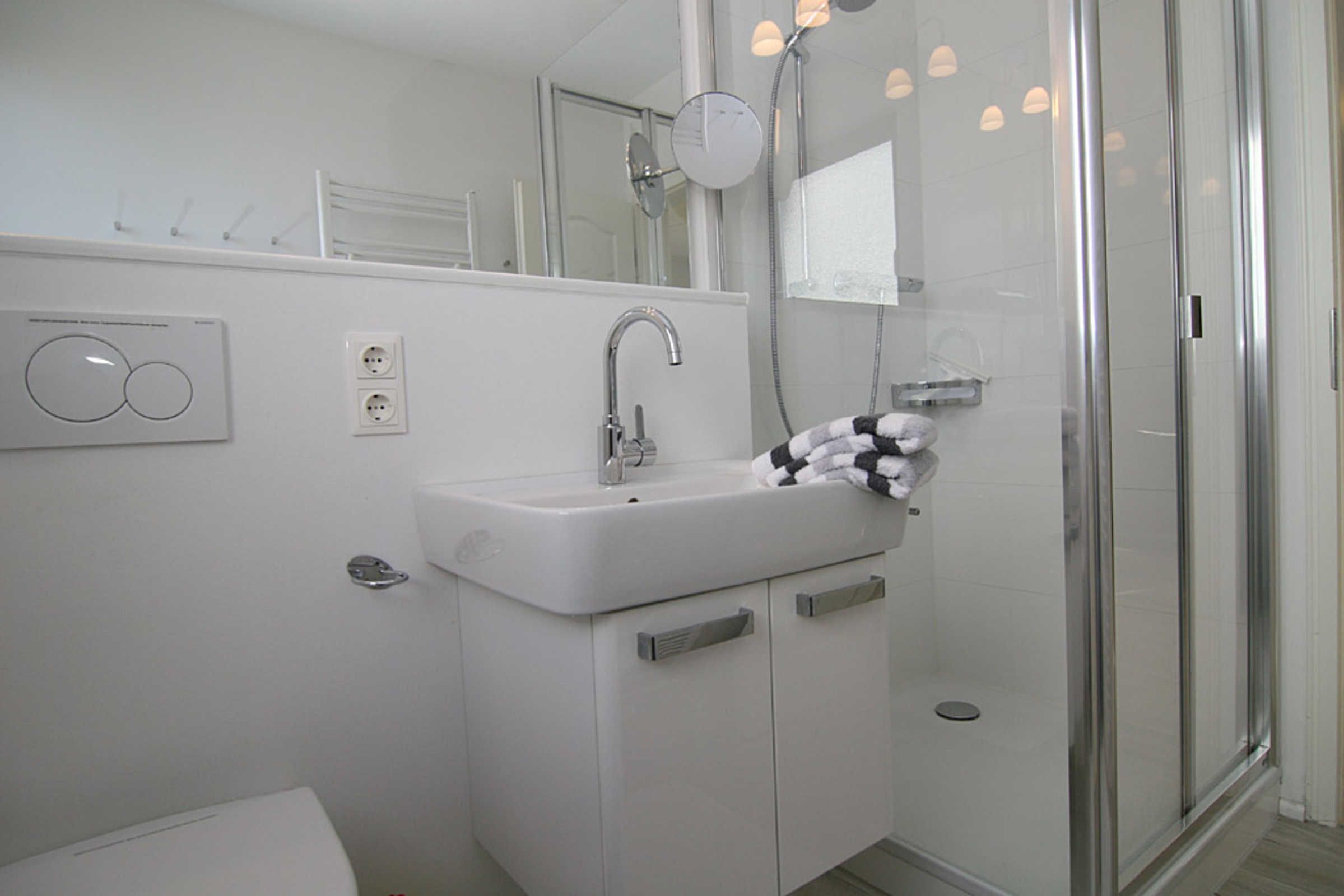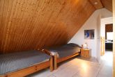 Die Ferienwohnung besteht aus einem großzügigen Wohn- und Essraum mit offener, komplett und hochwertig ausgestatteter Einbauküche, einem Esstisch und einer modernen, komfortablen Polstersitzgruppe. In dieser Etage befindet sich auch das Badezimmer mit Dusche und WC. Über eine schöne Holztreppe gelangt man in das Dachgeschoss mit zwei separaten Schlafzimmern. Ein Schlafzimmer hat ein Doppelbett im zweiten Schlafzimmer stehen zwei Einzelbetten.