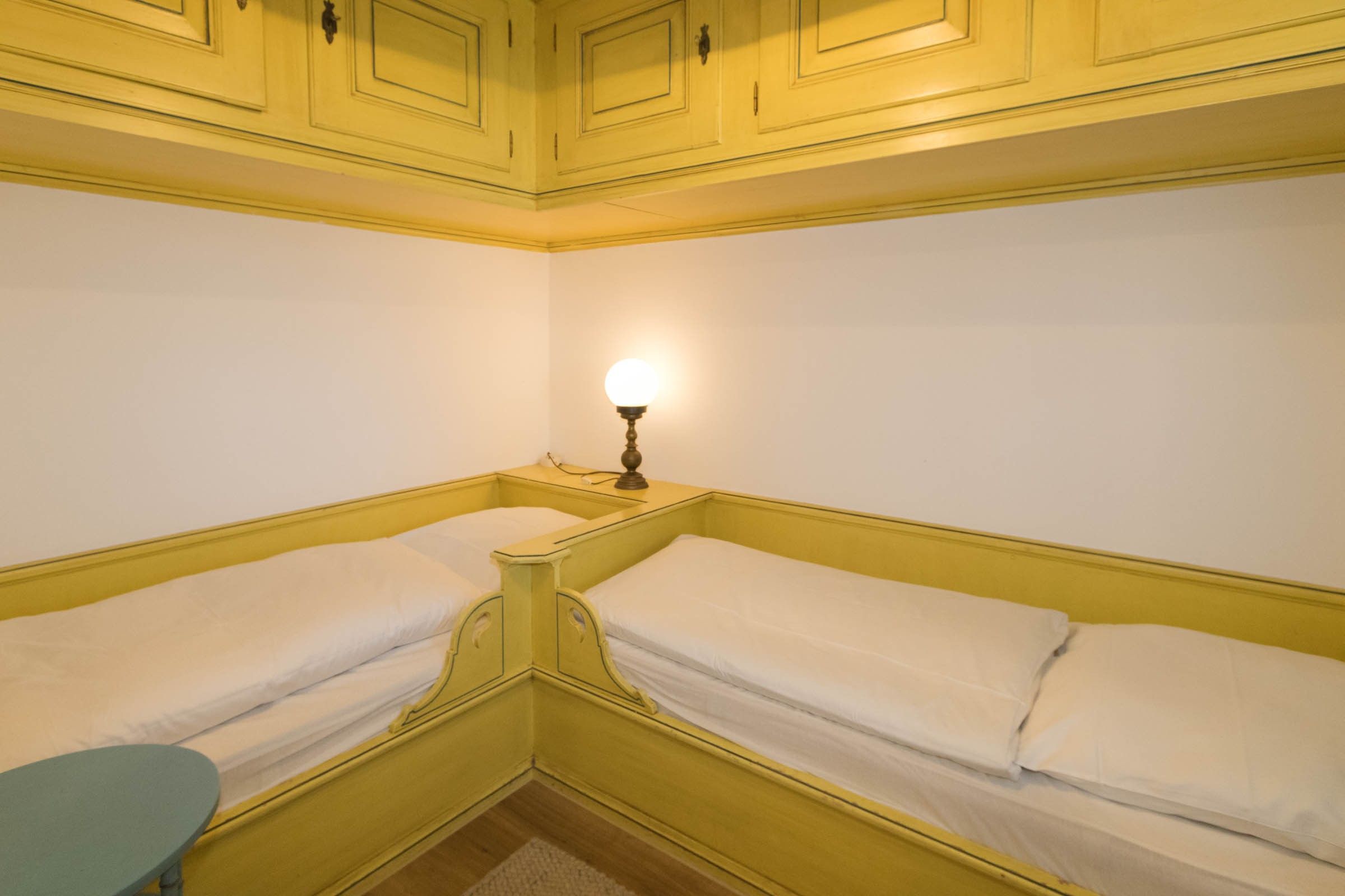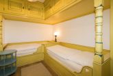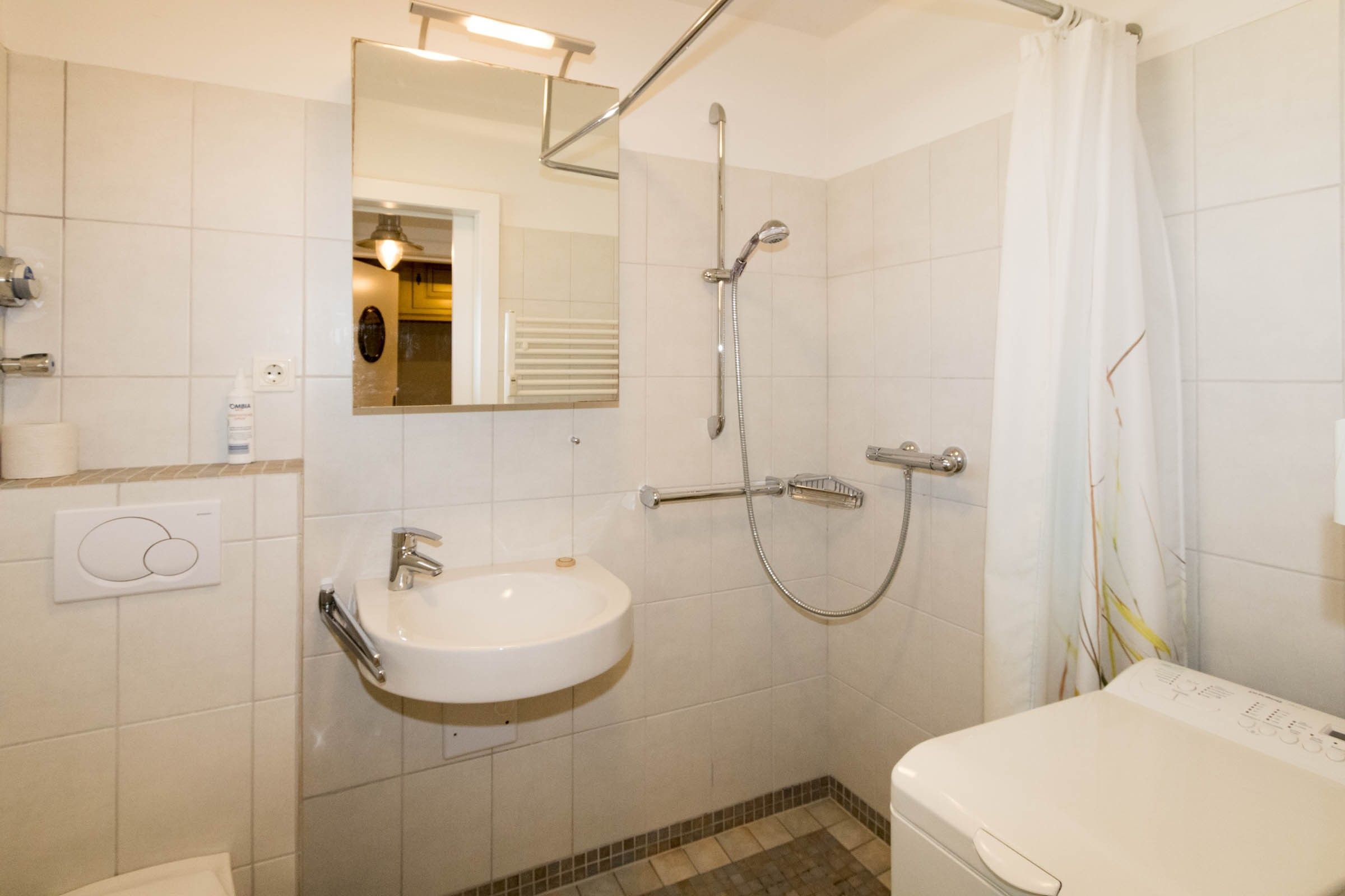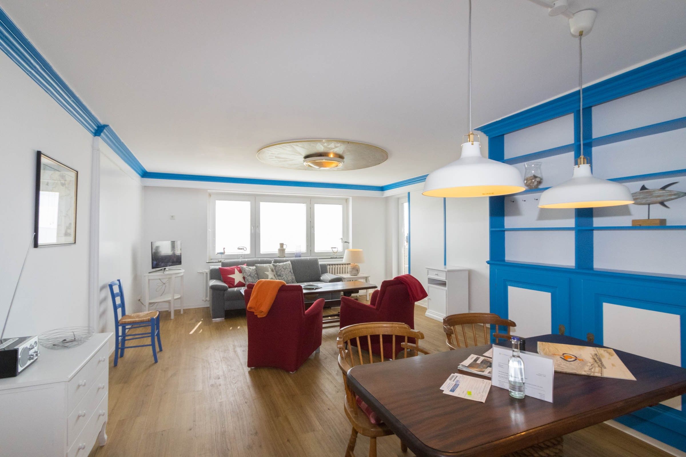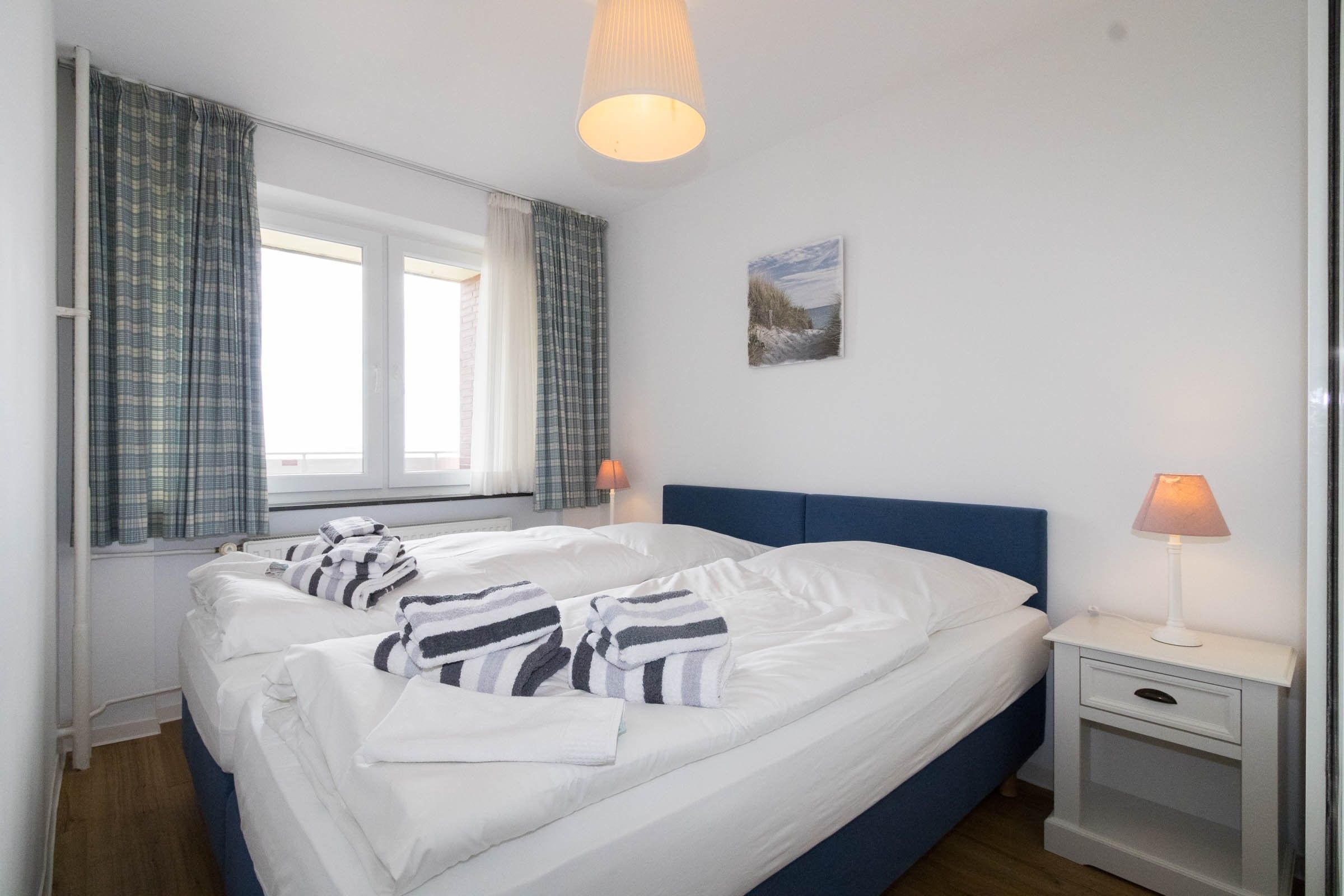 Zur Wohnung gehören zwei Schlafzimmer, eines ist mit Doppelbett und eines mit zwei einzelnen, eingebauten Kojenbetten eingerichtet. Das Duschbad verfügt über eine eigene Waschmaschine. Der Wohnraum bietet einen fantastischen Blick und hat eine Sitzecke direkt am Panoramafenster. Der Essplatz im Wohnbereich hat Platz für 6 Personen. Neben dem Flatscreen-Fernseher ist auch WLAN vorhanden. Vom Wohnbereich aus gelangen Sie auf den Ostbalkon, der mit Balkonmöbeln ausgestattet ist. Die Küche bietet alles, was man braucht, um gemütlich in der Ferienwohnung zu kochen.