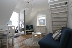 Diese Maisonette-Wohnung in der Mitte von Hörnum ist eine Wohlfühloase für max. 3 Personen. Sie gelangen direkt in den großzügigen Wohnraum, der mit Esstisch und Küchenzeile ausgestattet ist. Im Wohnbereich erwartet Sie ein Fernseher mit integriertem DVD-Player und eine Stereoanlage mit CD, Radio, USB-Eingang und Bluetooth. Auf dieser Ebene befindet sich auch das erste Schlafzimmer mit Doppelbett und das moderne Duschbad. Über die offene Treppe im Wohnraum kommt man in das 2. Schlafzimmer mit Einzelbett, geeignet für Erwachsene sowie auch Kinder.