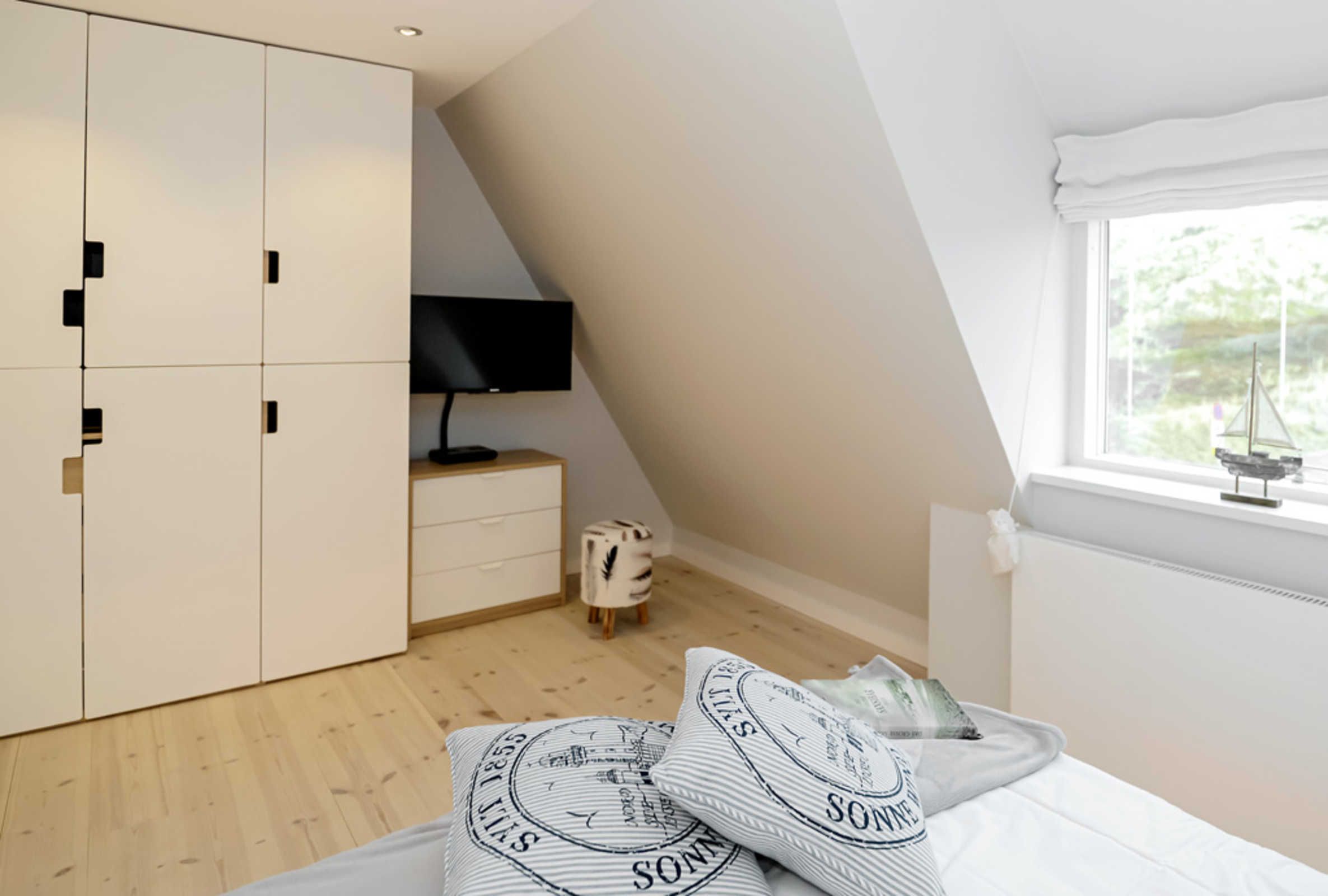 Die Küche ist vollständig für bis zu 6 Personen ausgestattet. Vom Essplatz aus schauen Sie direkt in den zum Süden liegenden Gartenbereich. Große Fensterfronten tragen zum großzügig wirkenden Innenbereich bei. Das Haus verfügt über 3 Schlafzimmer mit Doppelbetten. Im oberen Bereich befindet sich ein Duschbad mit Fußbodenheizung. Im EG liegt das zweite Duschbad von dem aus man in den Saunabereich gelangt. Das komplette Erdgeschoß verfügt über eine Fußbodenheizung.
