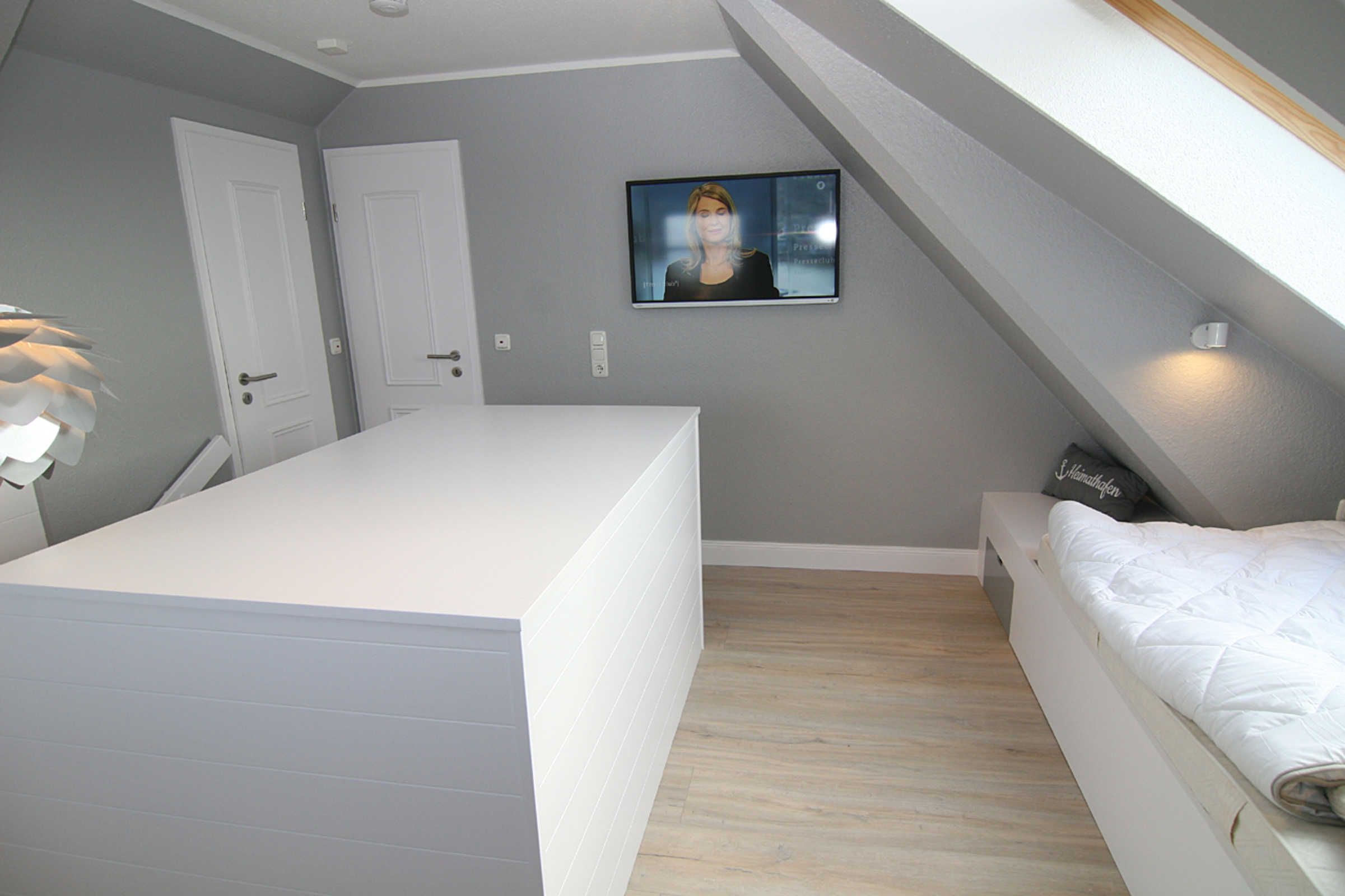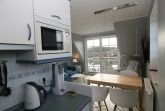 Die Wohnung ist aufgeteilt in einen Wohn-/Essbereich mit Balkon zum Süden und angrenzender Küchenzeile, 1 Schlafzimmer mit Doppelbett, eine Galerie mit 2 getrennt stehenden Betten und 2 Duschbädern.