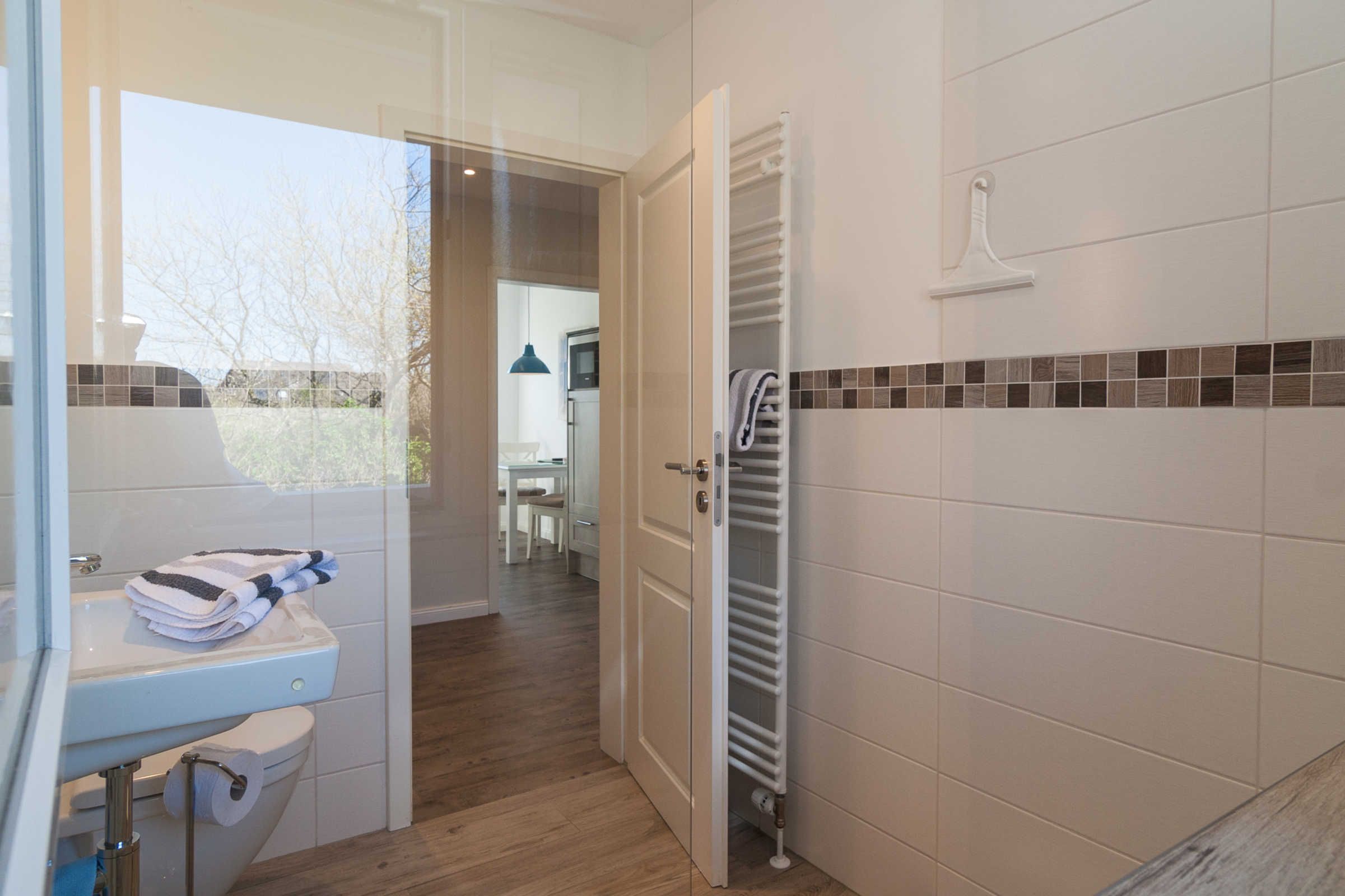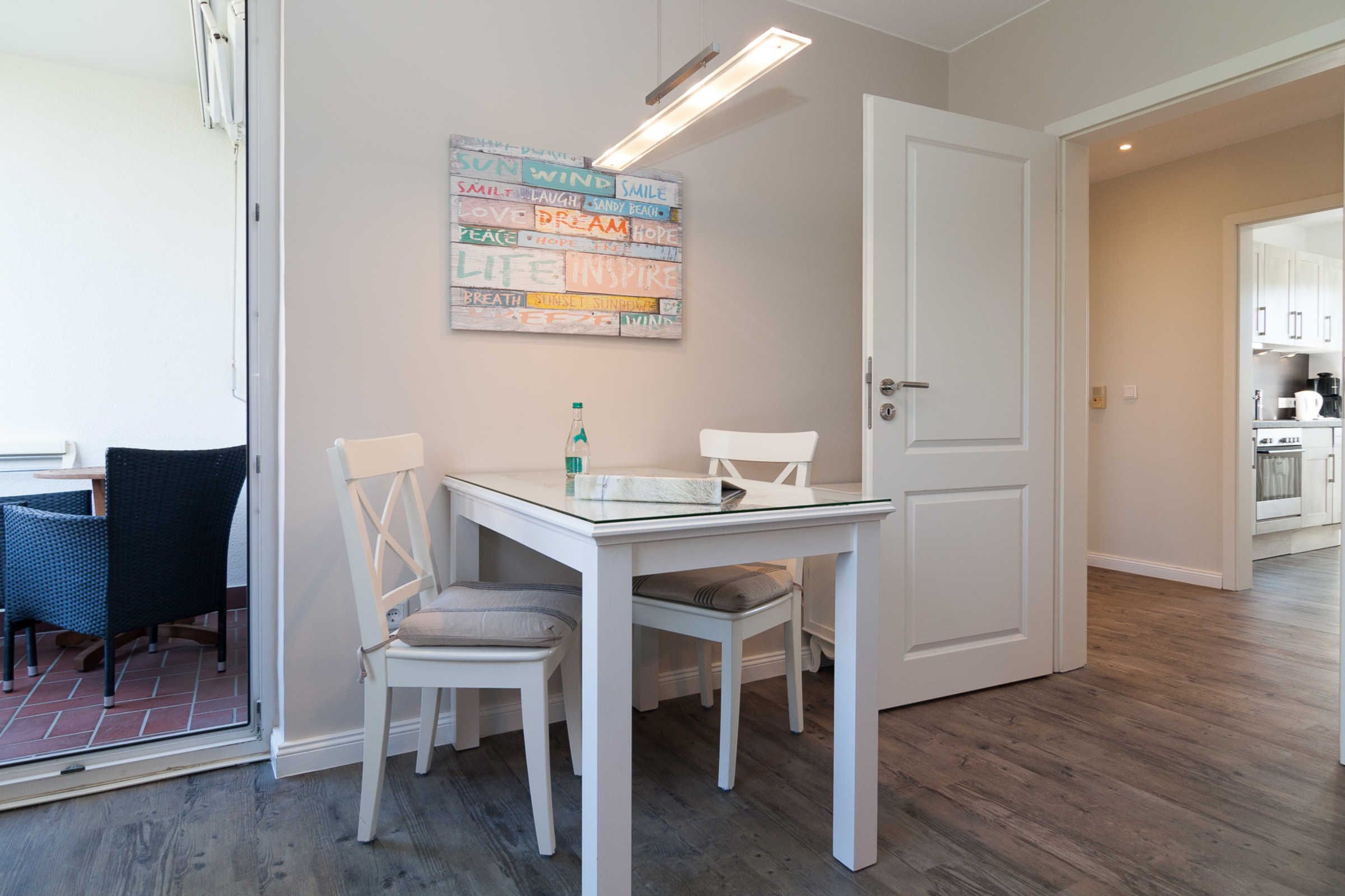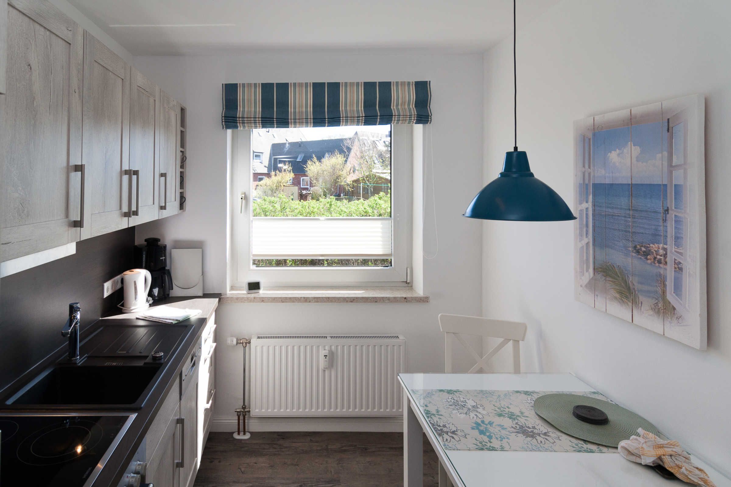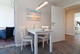 Die gemütliche, geschlossene Küche ist mit allem ausgestattet, was Sie brauchen: einem Cerankochfeld, Backofen, Spülmaschine und Mikrowelle. Hier können Sie leckere Mahlzeiten zubereiten und sich am Gartentisch auf dem Balkon erholen, während Sie den Blick ins Grüne genießen. Der Balkon ist der ideale Ort, um die frische Nordseeluft zu inhalieren oder ein gutes Buch zu lesen.