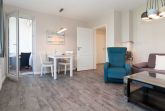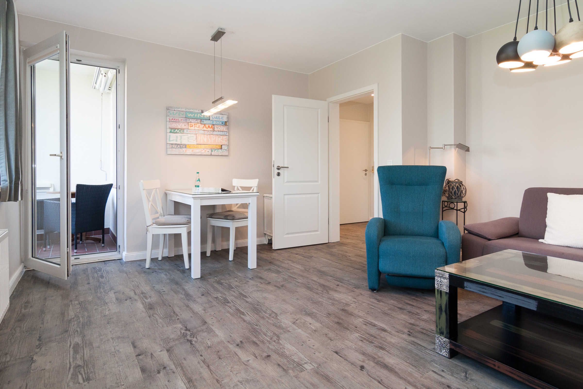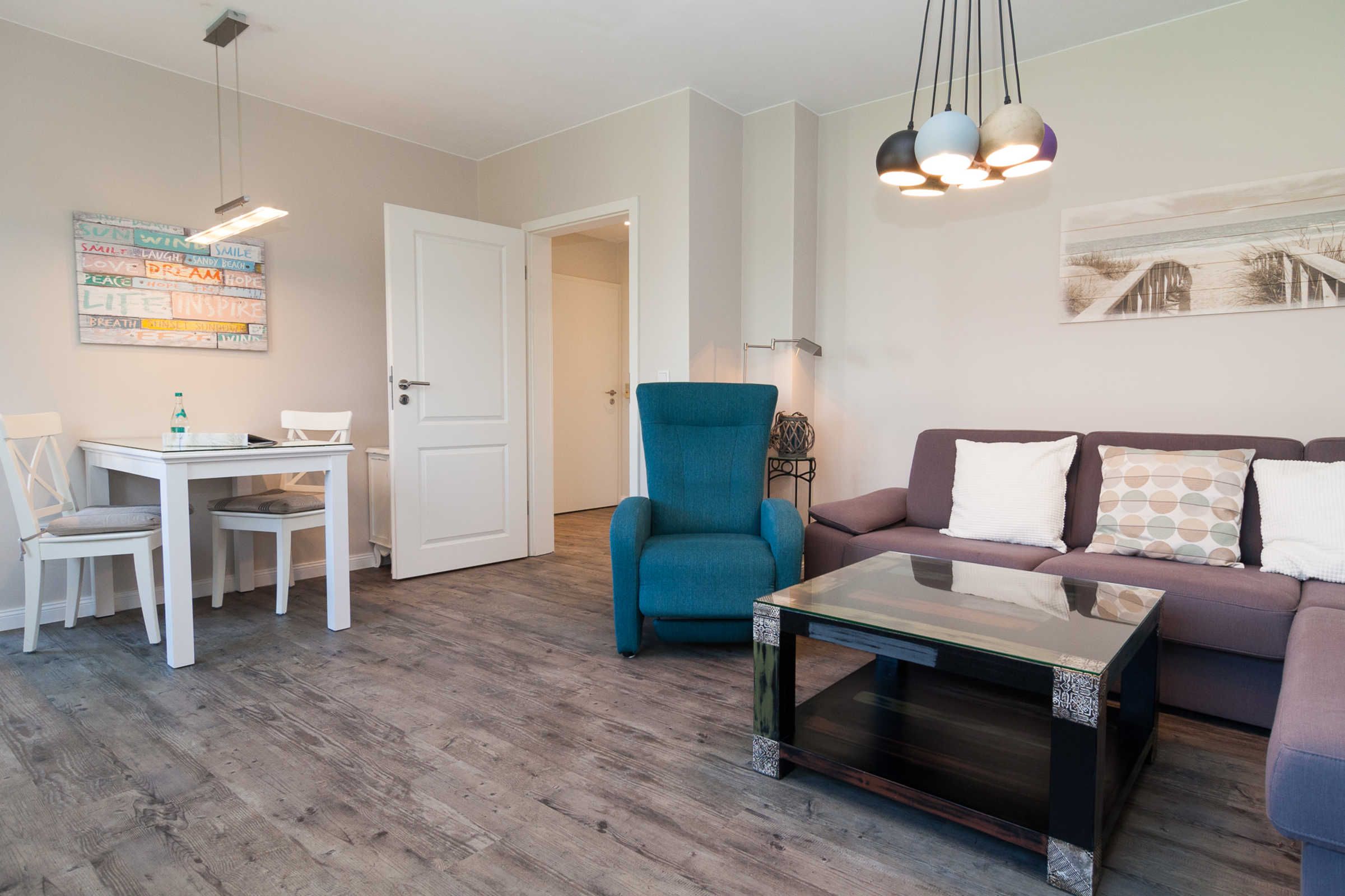 Mit einer großzügigen Fläche von 58 m² erwartet Sie eine lichtdurchflutete und freundlich gestaltete Wohnung, die mit vielen Annehmlichkeiten ausgestattet ist, um Ihnen einen komfortablen Aufenthalt zu gewährleisten. Das stilvolle Wohnzimmer lädt zum Entspannen ein und bietet eine Sofaecke sowie einen Esstisch, an dem Sie gemütliche Abende mit Ihren Liebsten verbringen können. Zur technischen Ausstattung gehört ein moderner Fernseher mit Satellitenanschluss sowie eine HiFi-Anlage, damit Sie Ihre Lieblingsmusik oder Filme genießen können.