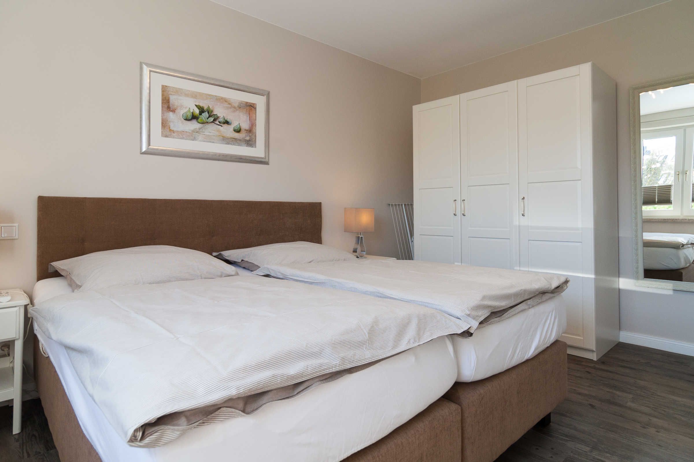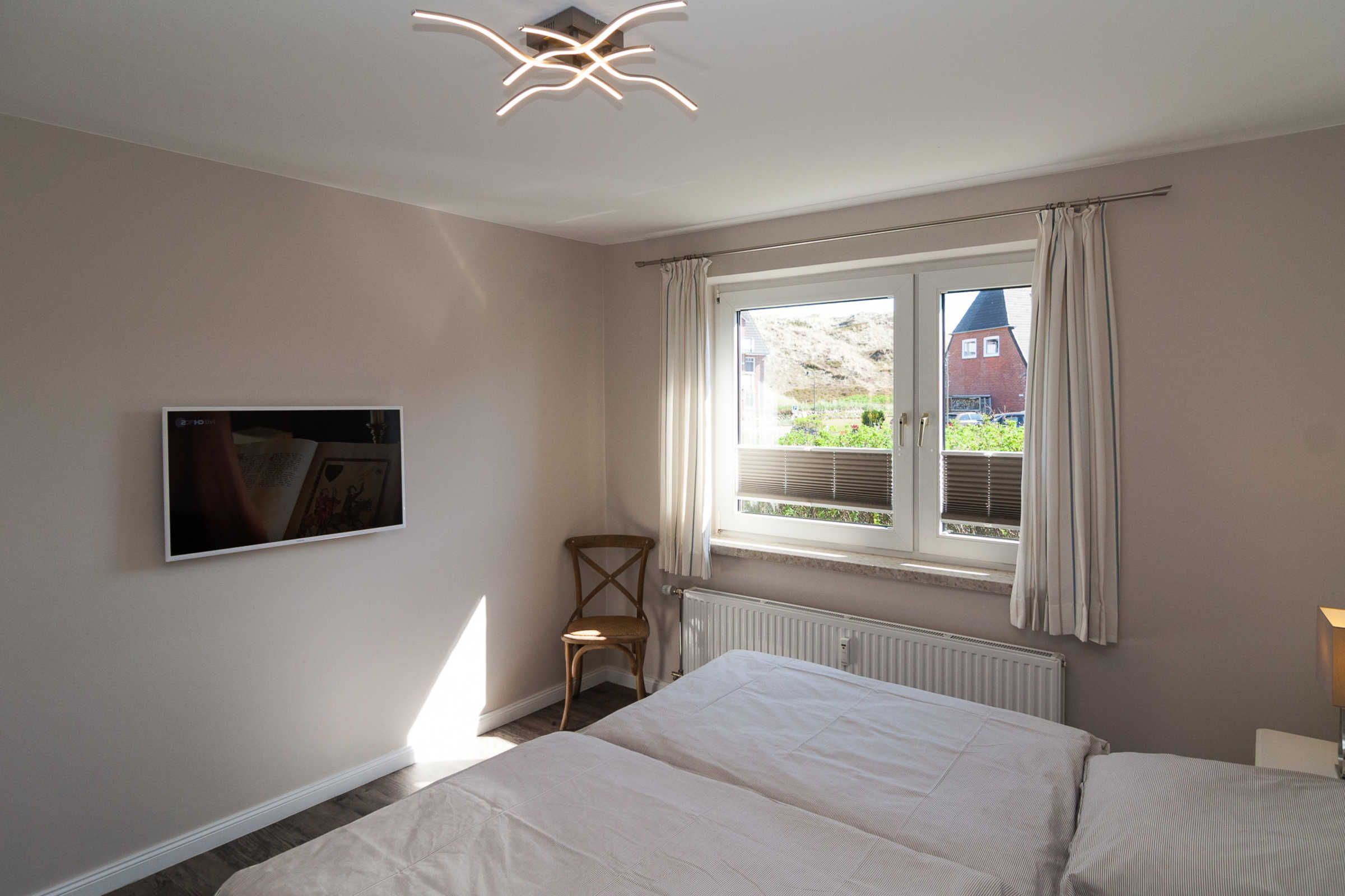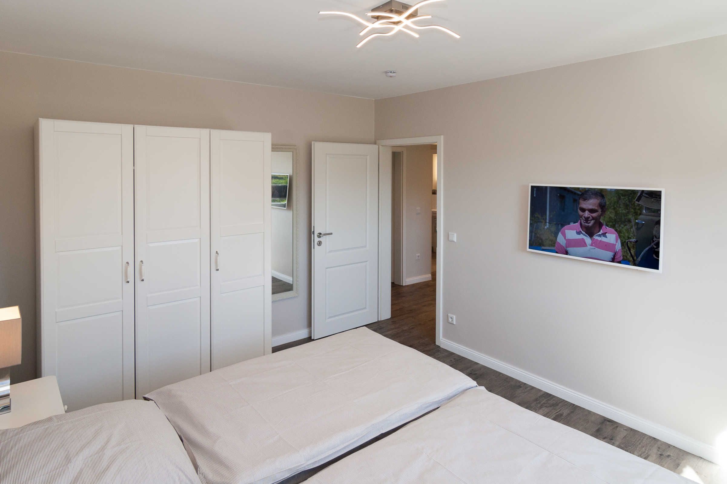 Die Ferienwohnung verfügt über ein komfortables Schlafzimmer mit einem Boxspringbett sowie einem Fernseher. Ein modernes Badezimmer mit bodengleicher Dusche, WC und Waschbecken sorgt zudem für zusätzlichen Komfort. Selbstverständlich sind auch praktische Dinge wie eine Waschmaschine, Trockner (im seitlichen Eingang) und Wäscheständer vorhanden, die für einen sorgenfreien Aufenthalt sorgen.