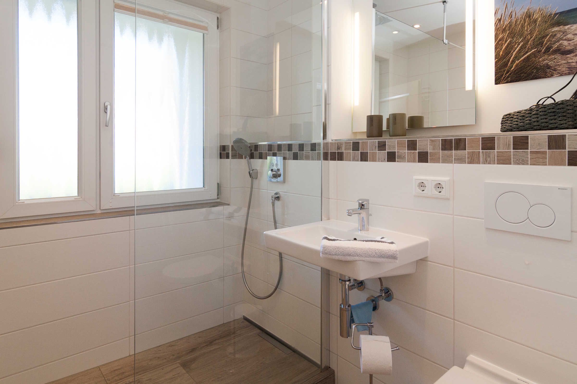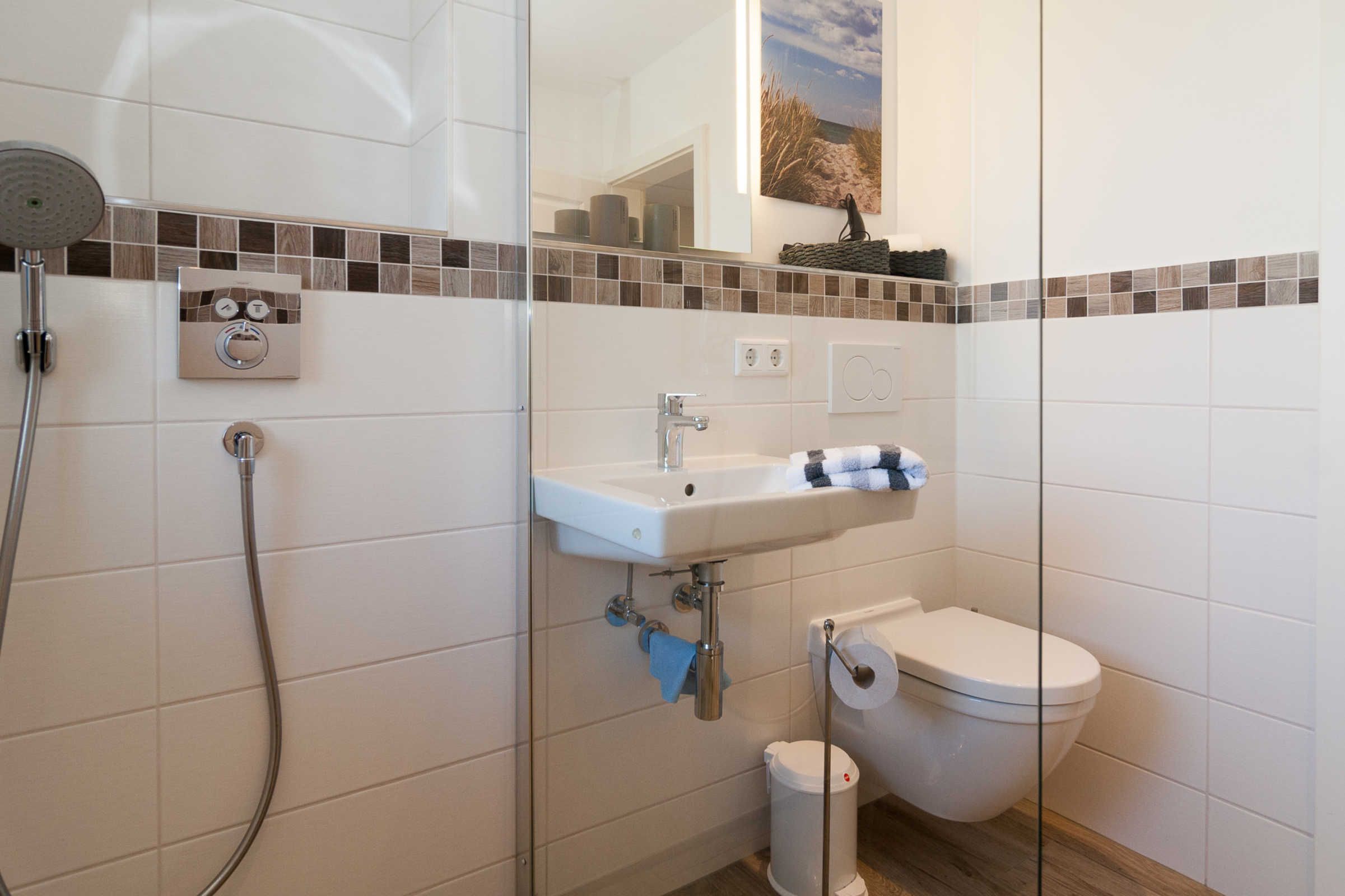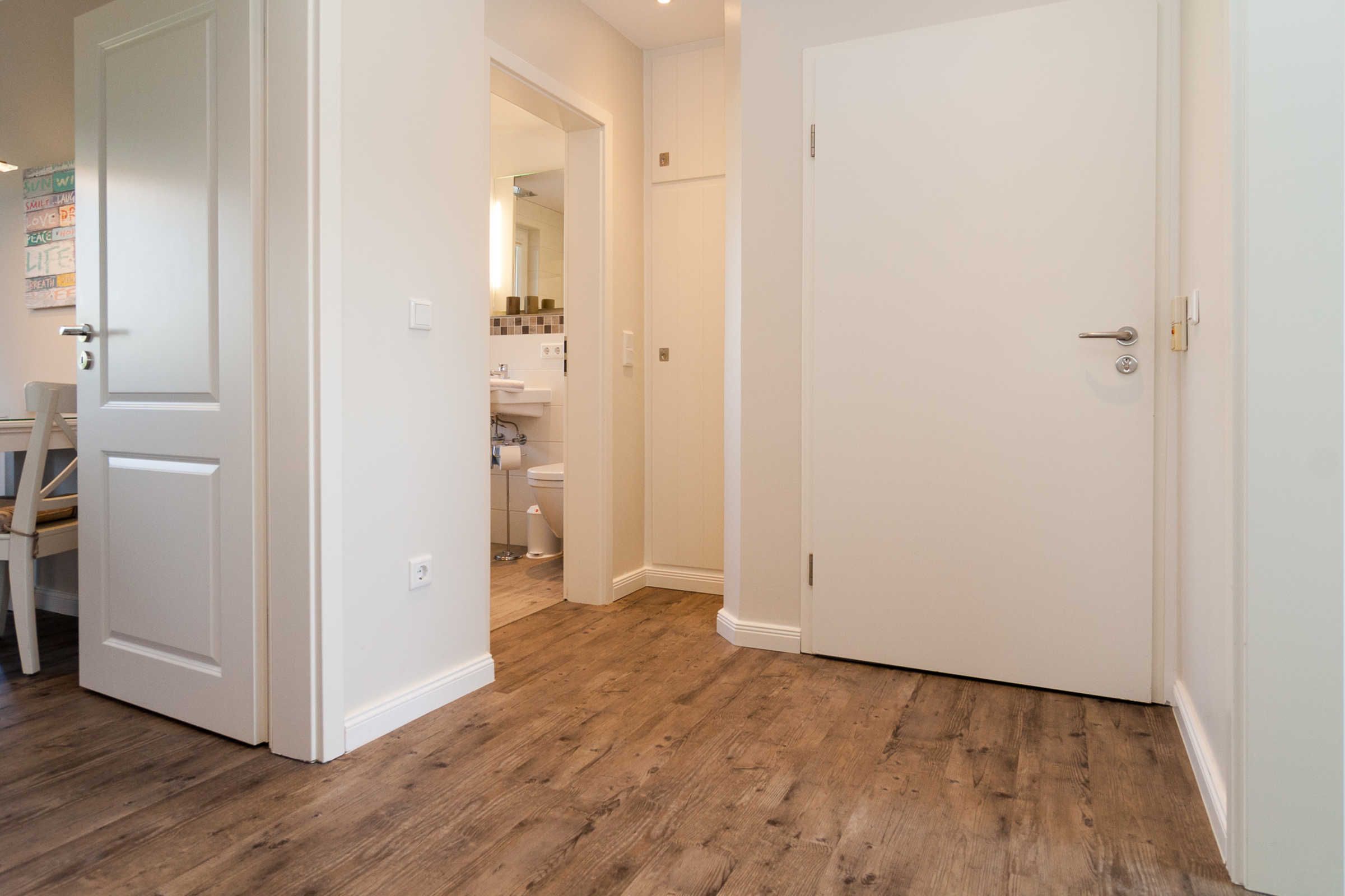 Die Ferienwohnung verfügt über ein komfortables Schlafzimmer mit einem Boxspringbett sowie einem Fernseher. Ein modernes Badezimmer mit bodengleicher Dusche, WC und Waschbecken sorgt zudem für zusätzlichen Komfort. Selbstverständlich sind auch praktische Dinge wie eine Waschmaschine, Trockner (im seitlichen Eingang) und Wäscheständer vorhanden, die für einen sorgenfreien Aufenthalt sorgen.