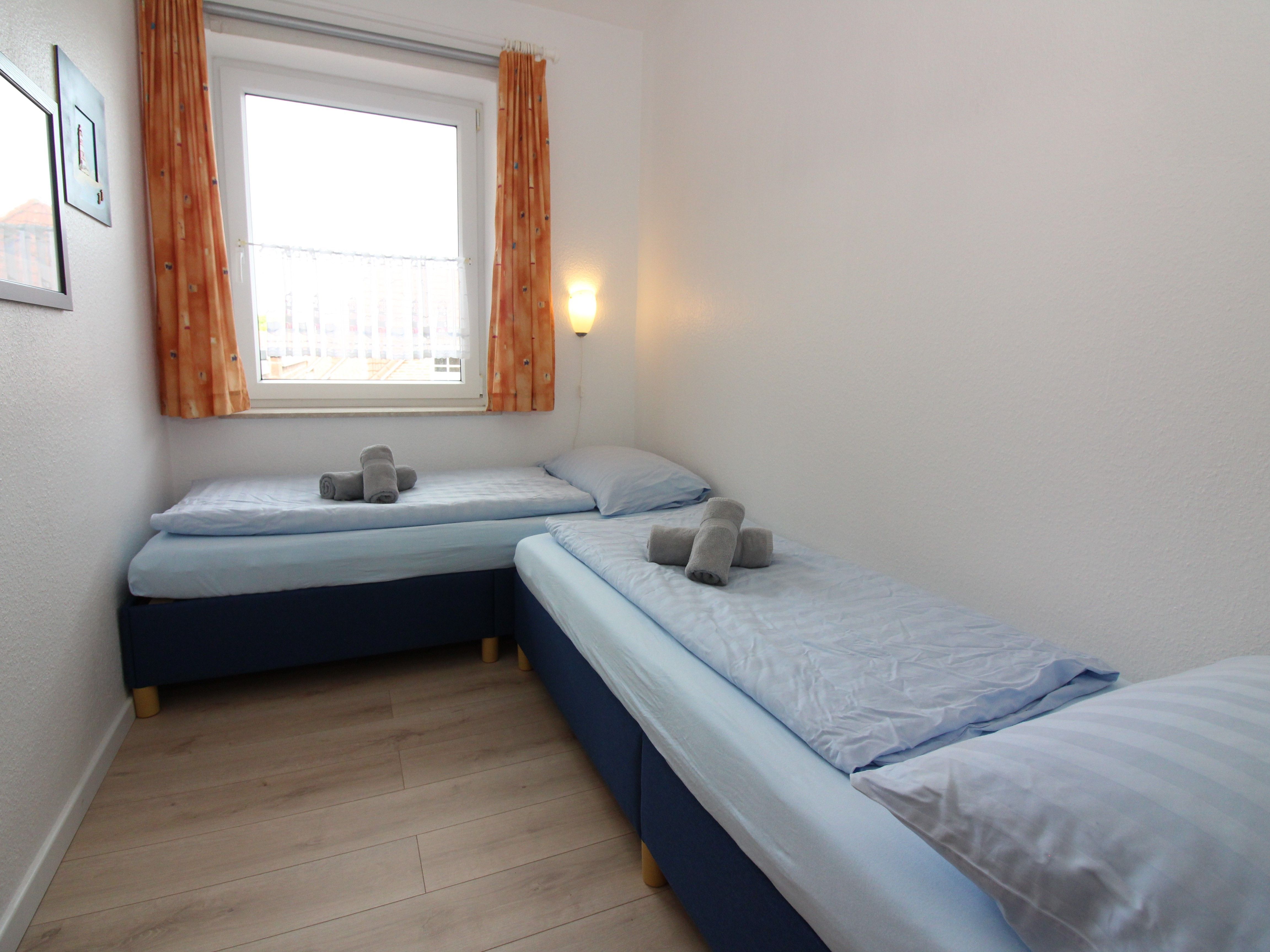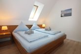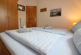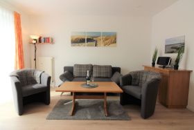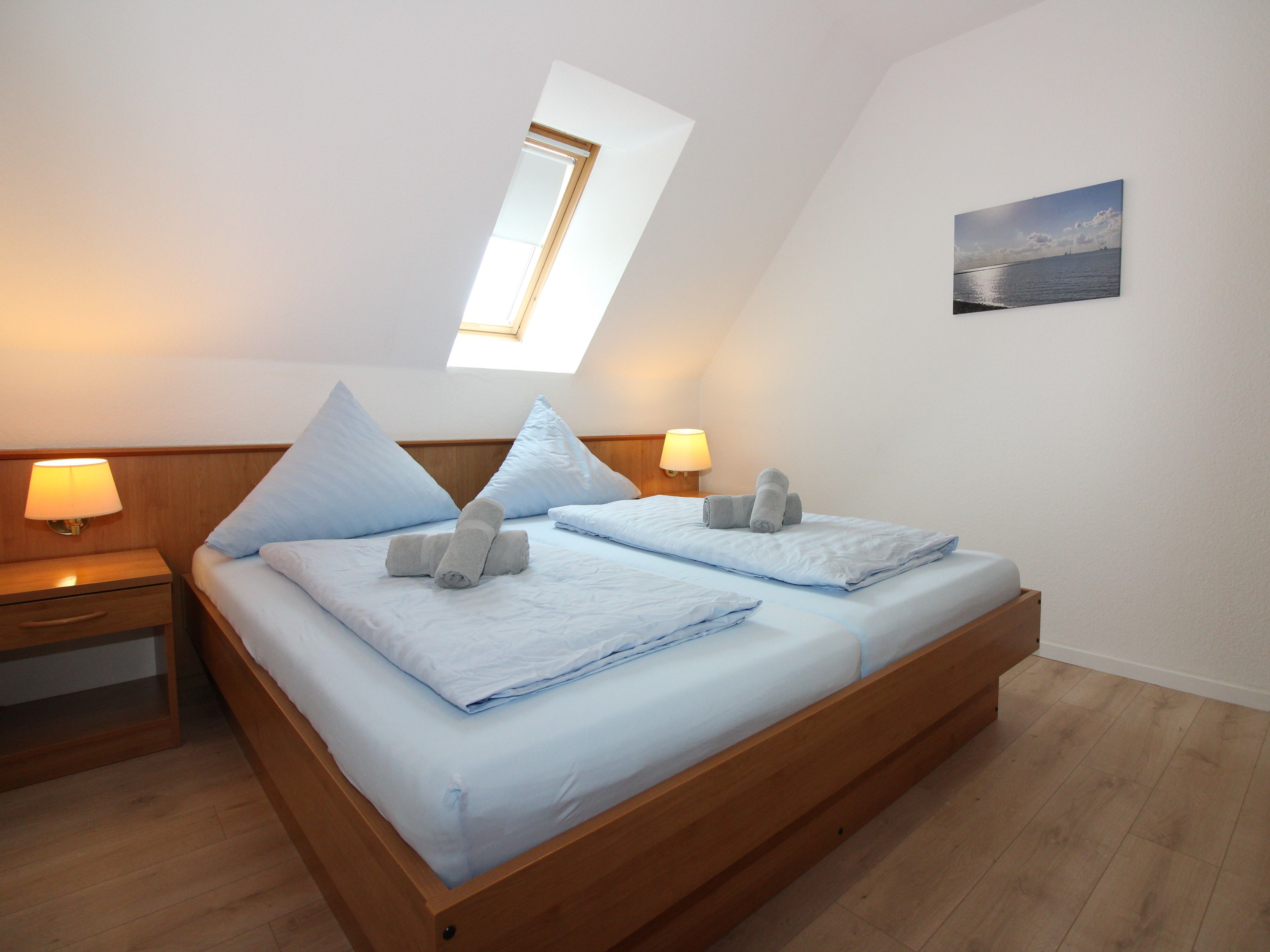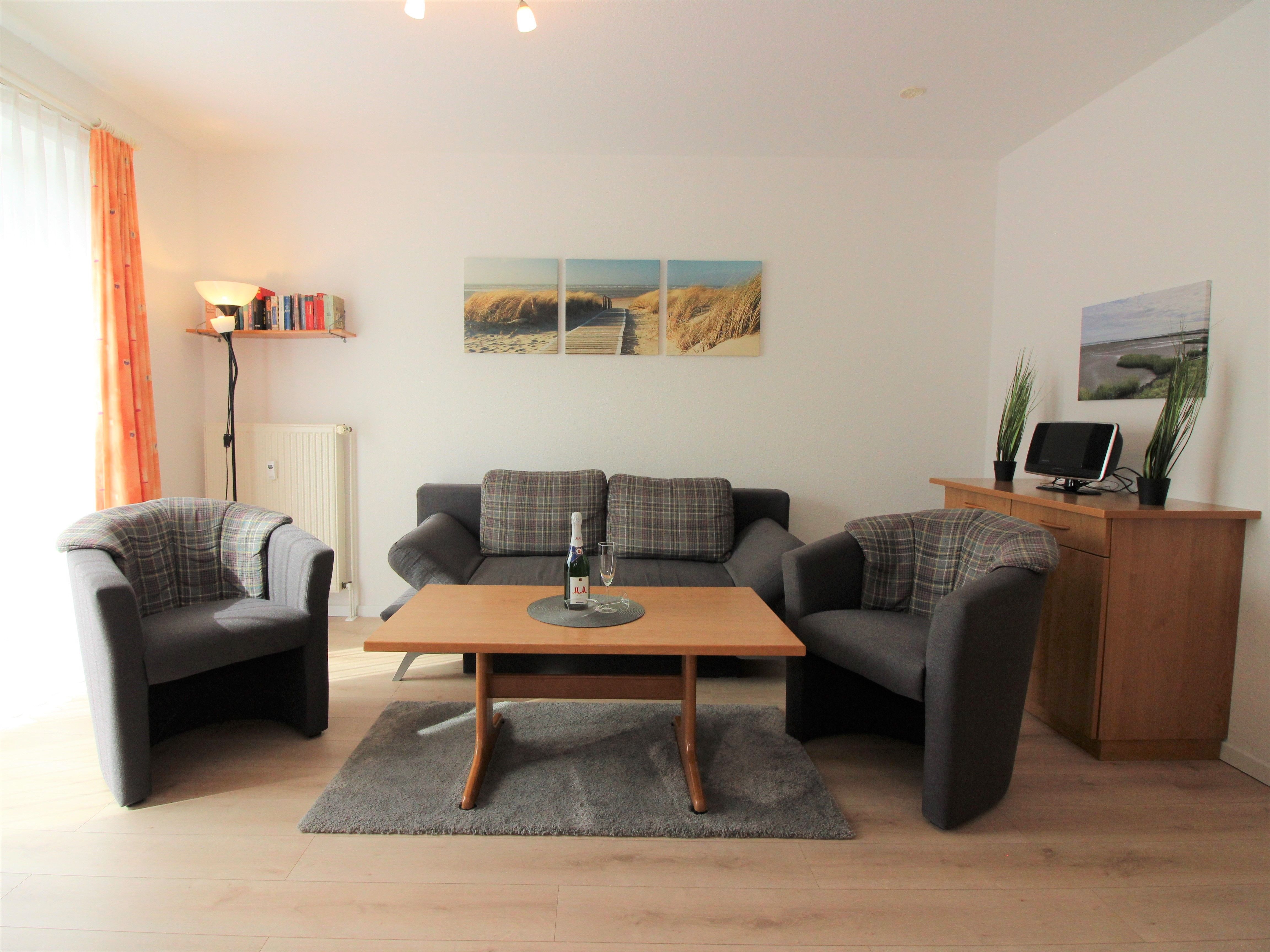 Sie wohnen in einem 3-Raum-Appartement im Obergeschoss für bis zu 6 Personen auf ca. 50 m² Wohnfläche. Die Wohnung verfügt über einen Schlafraum mit Doppelbett und einem LCD Flachbild-TV, ein Kinderzimmer mit zwei einzeln stehende Betten, einen hellen Wohn- Schlafraum mit bequemer Doppelbettcouch nebst voll ausgestattetem Küchenbereich mit Geschirrspüler und Mikrowelle, einem separaten Essplatz sowie Bad mit Dusche/WC und Föhn. Moderner Linoleumboden im Schlafzimmer, im Kinderzimmer und im Wohnbereich.